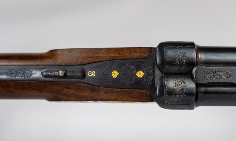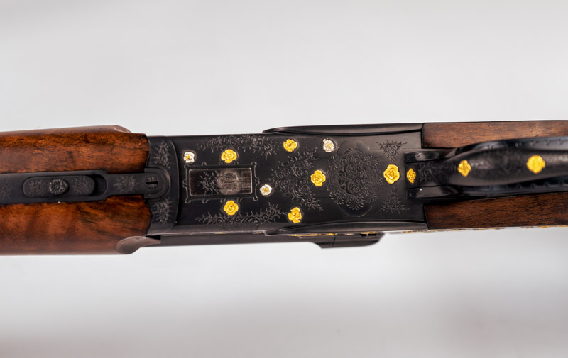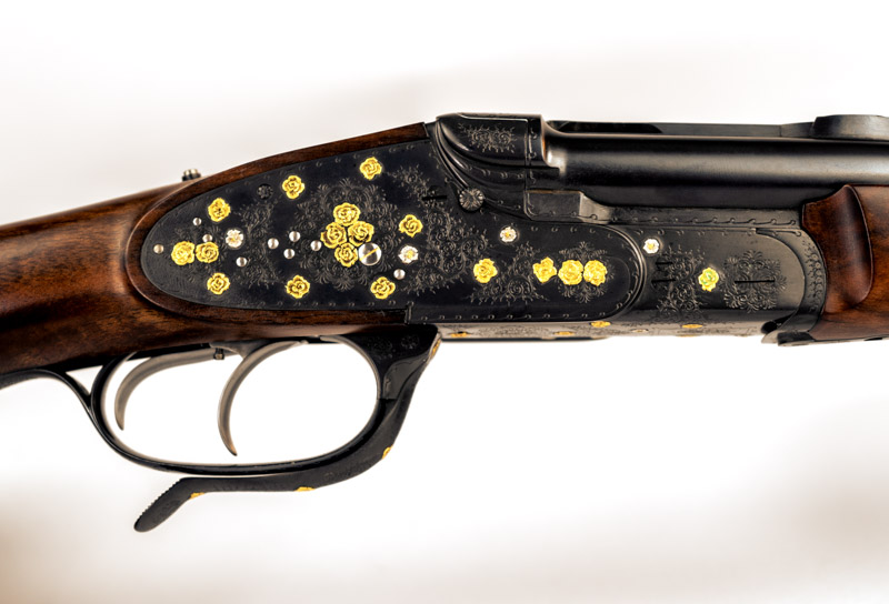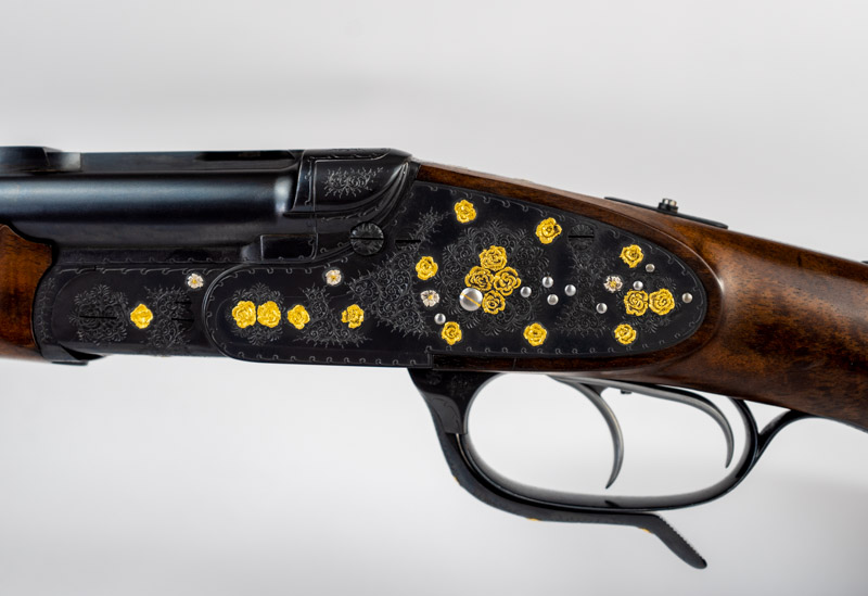 Gravur: Buquetgravur mit englischer Arabeskenergänzung, eingelagerten erhabenen Goldrosen und Silberblüten