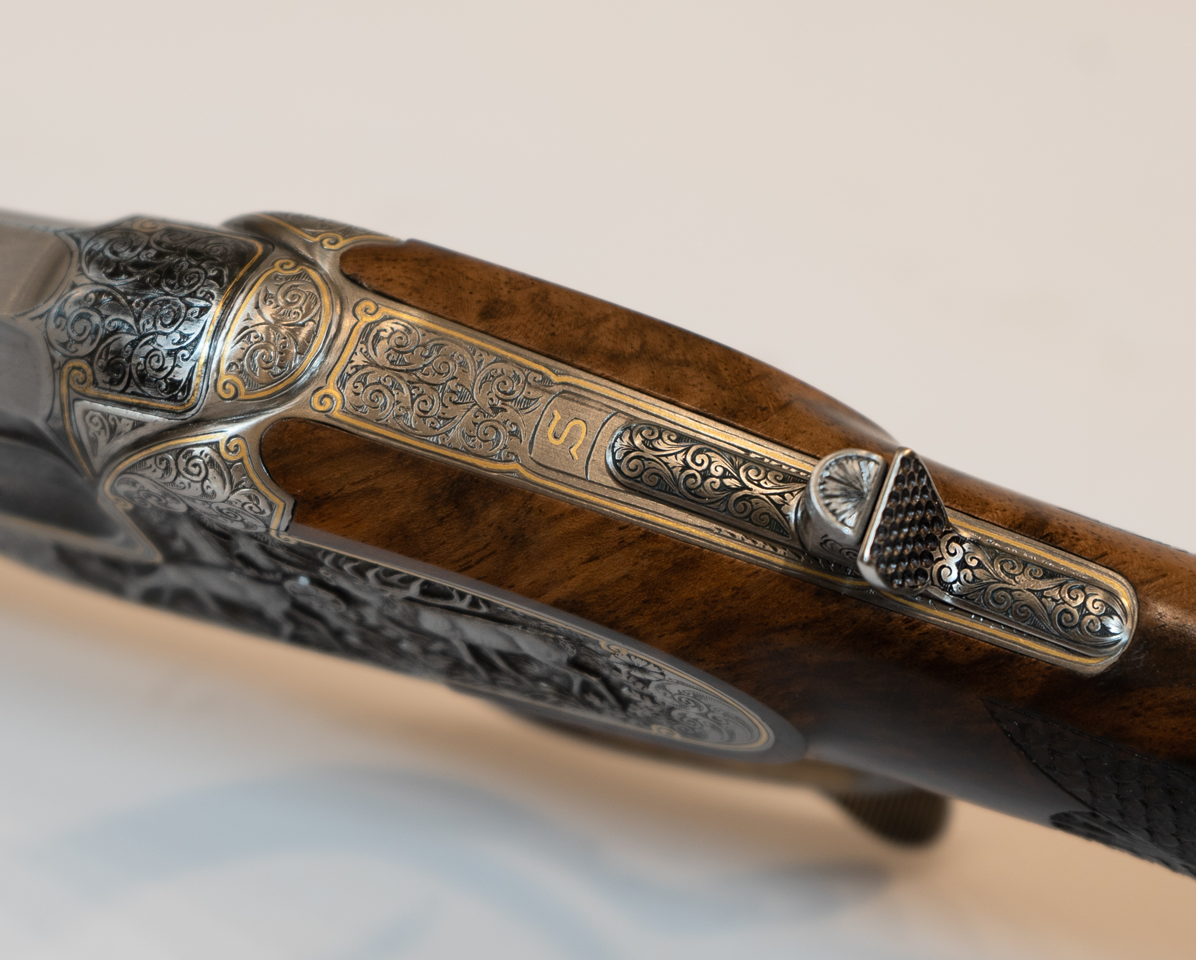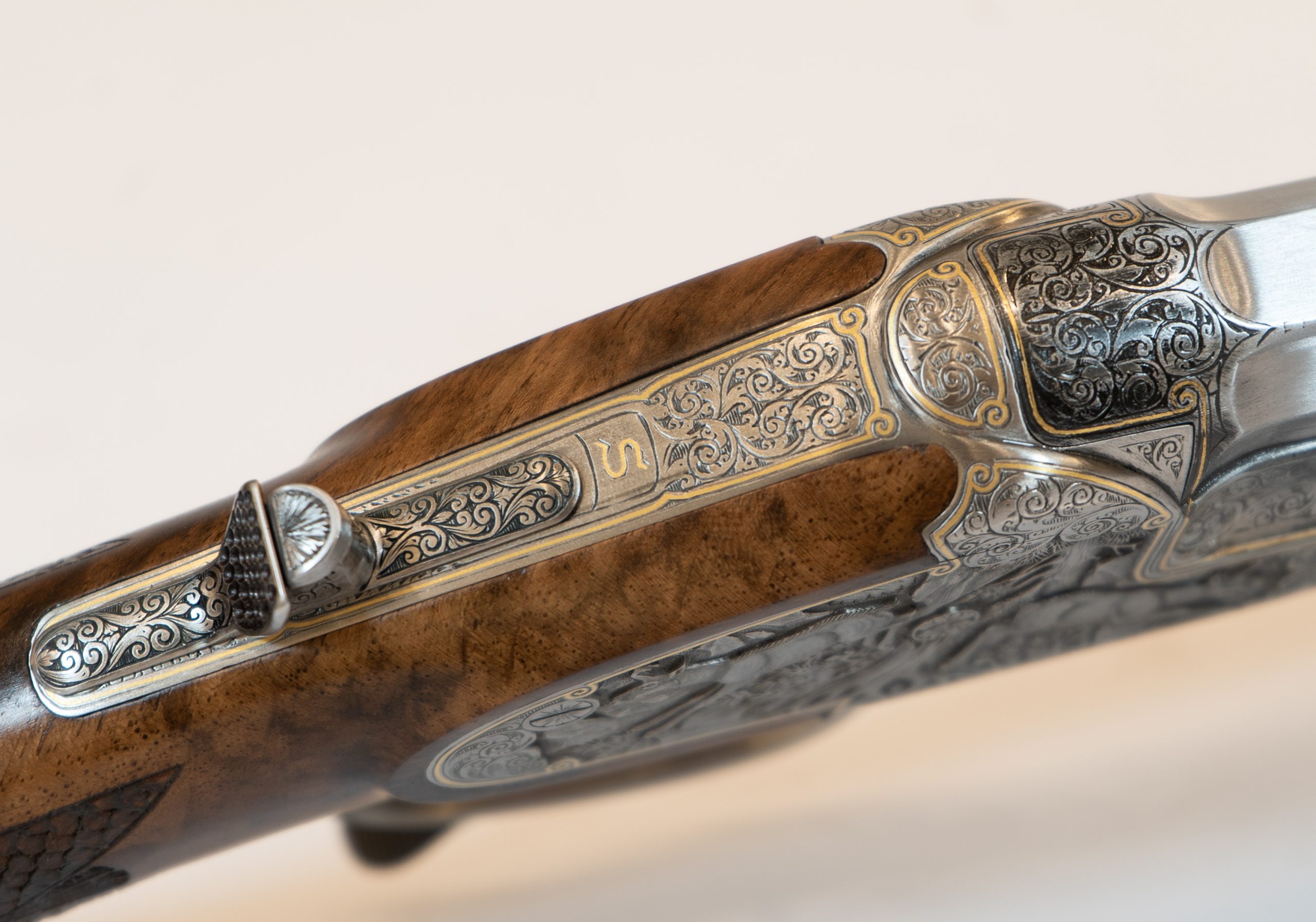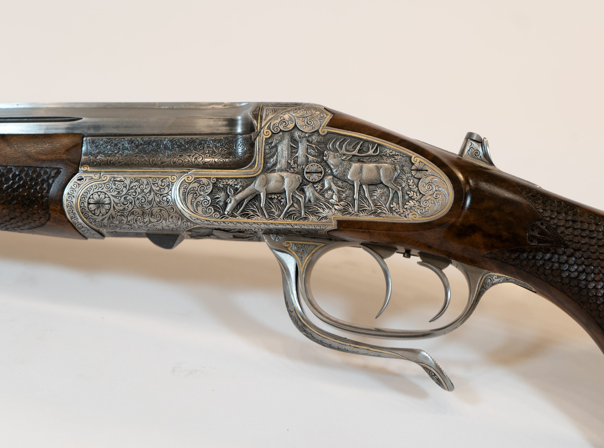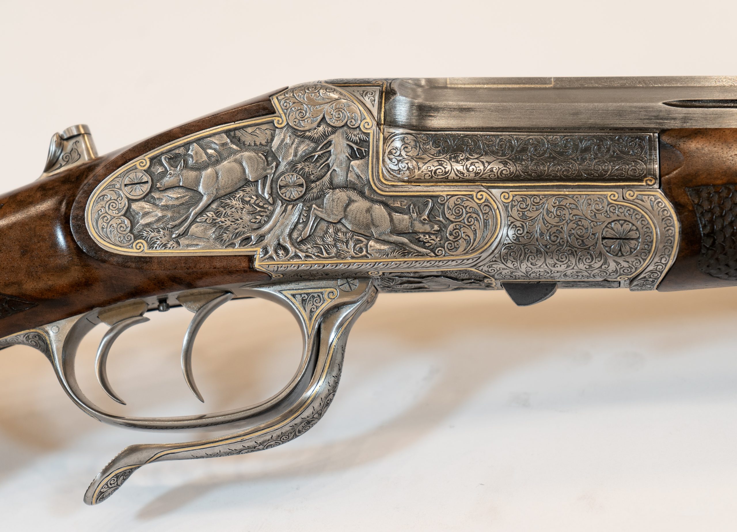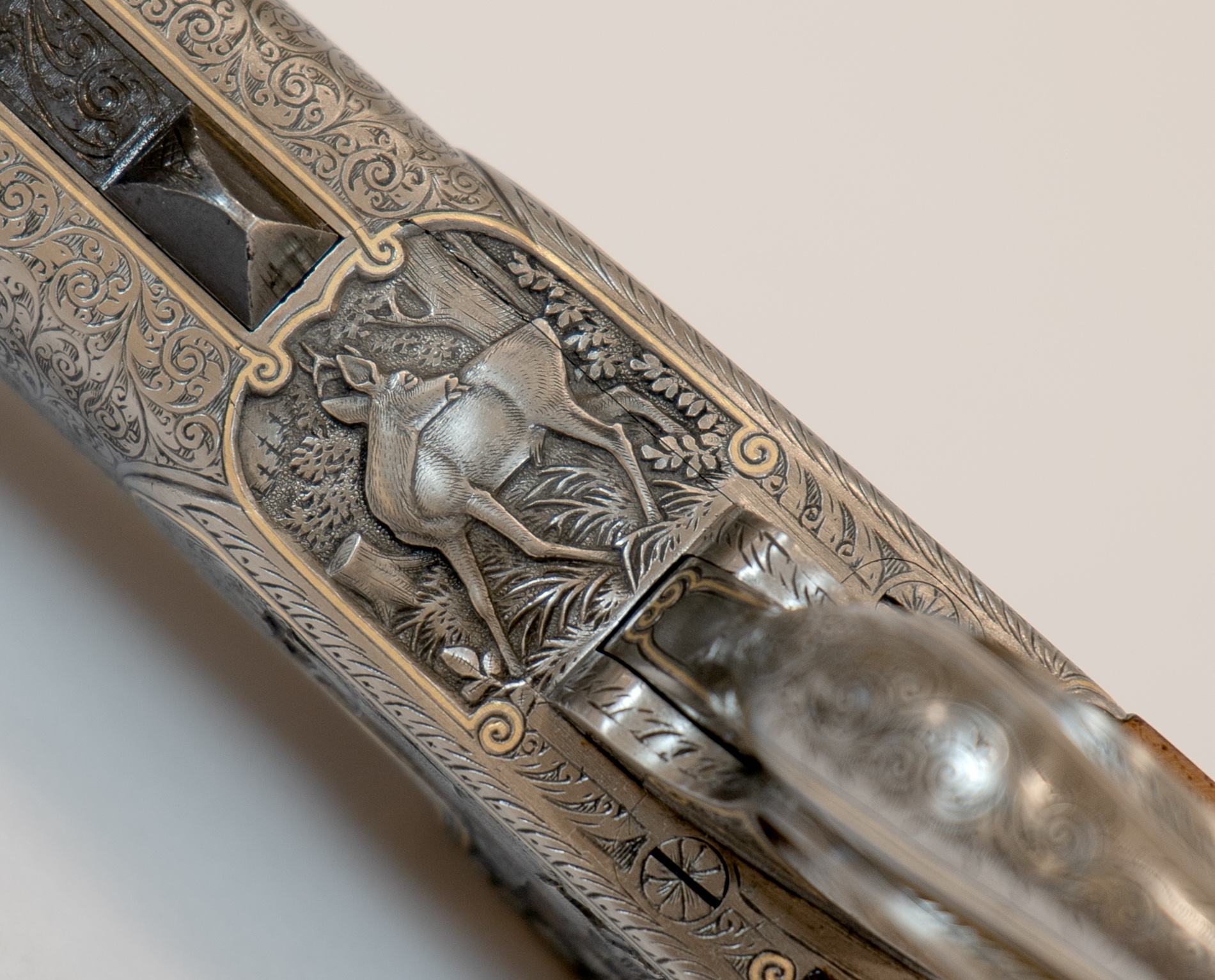 Gravur: Tiefgestochene Tierstückgravur, altdeutsche Arabeskenergänzung, Goldfaden mit Einrollungen