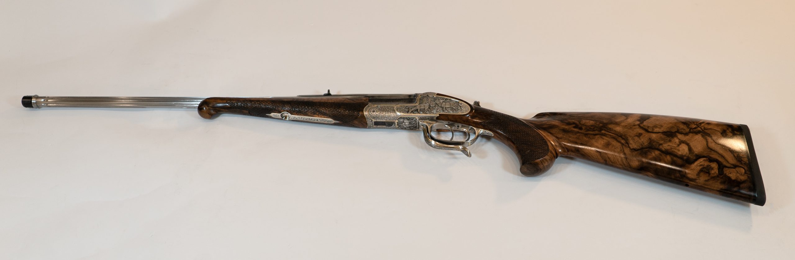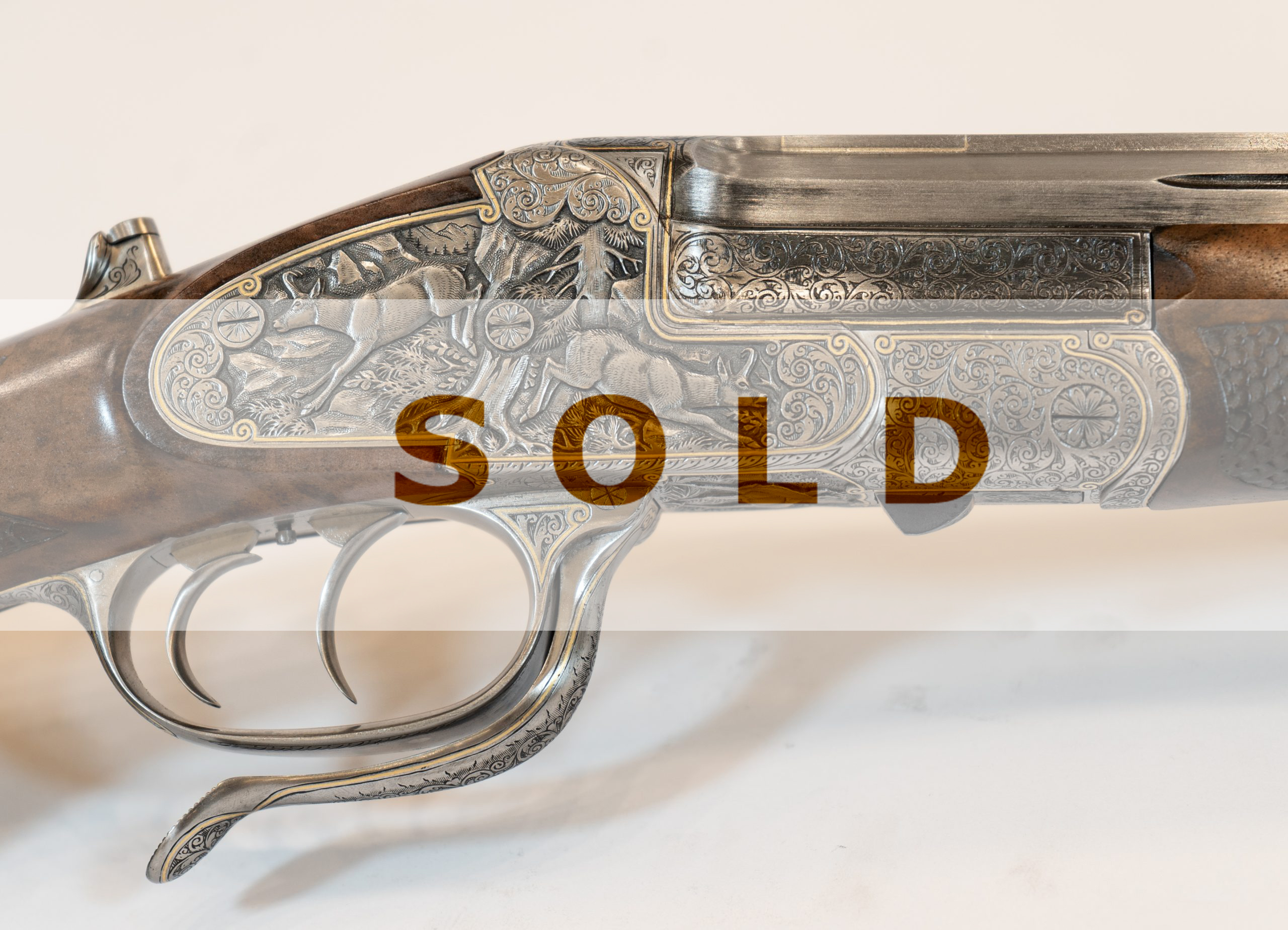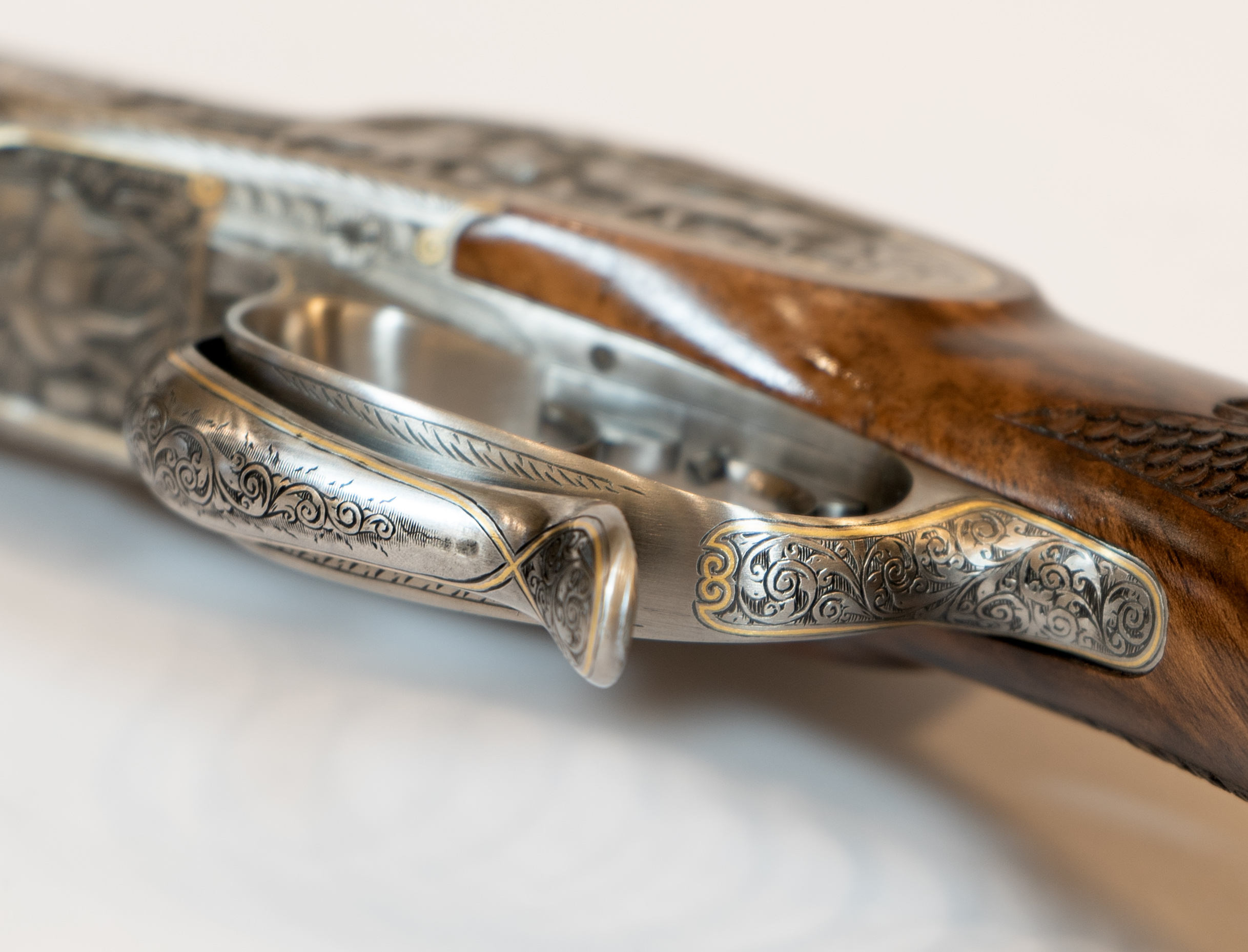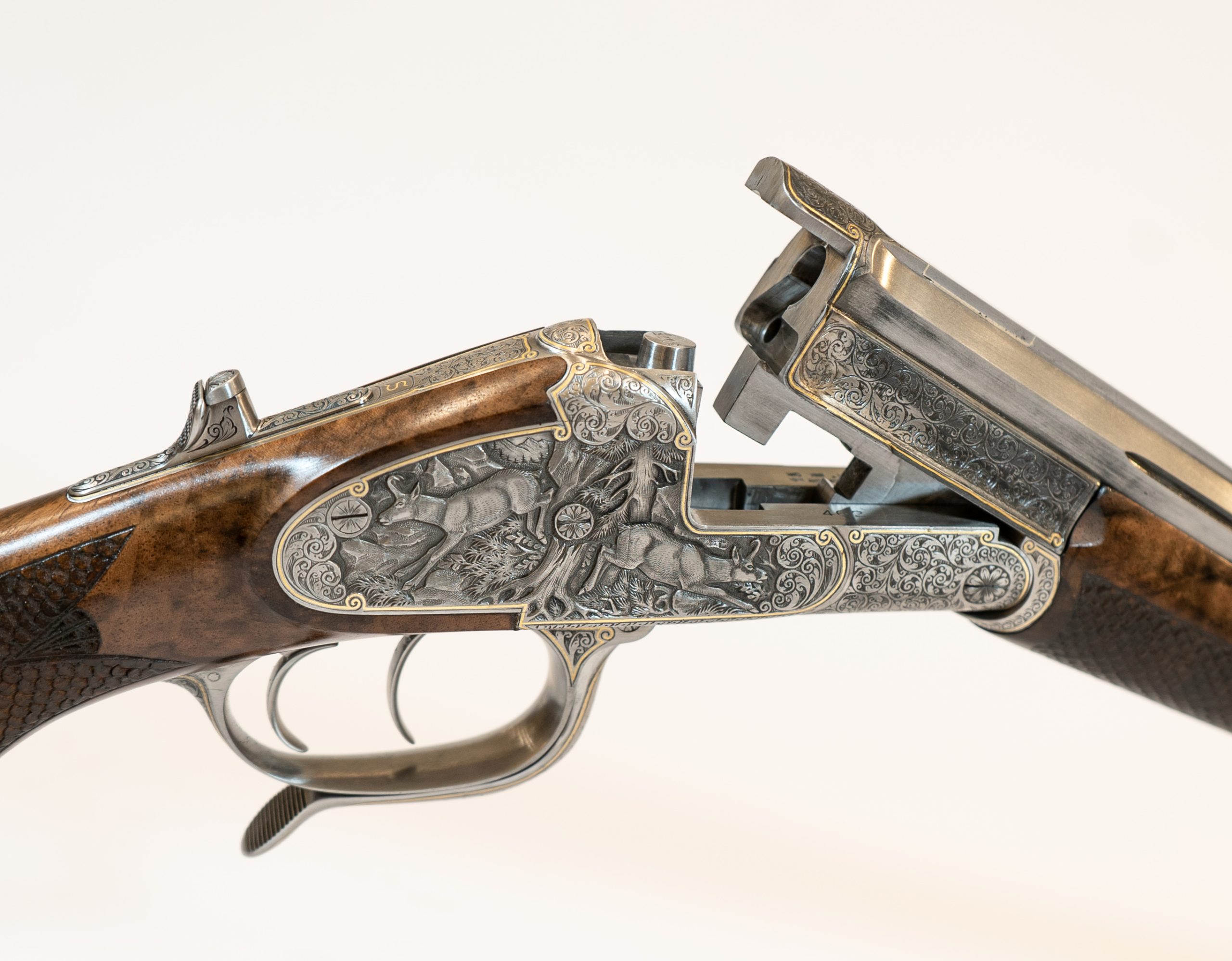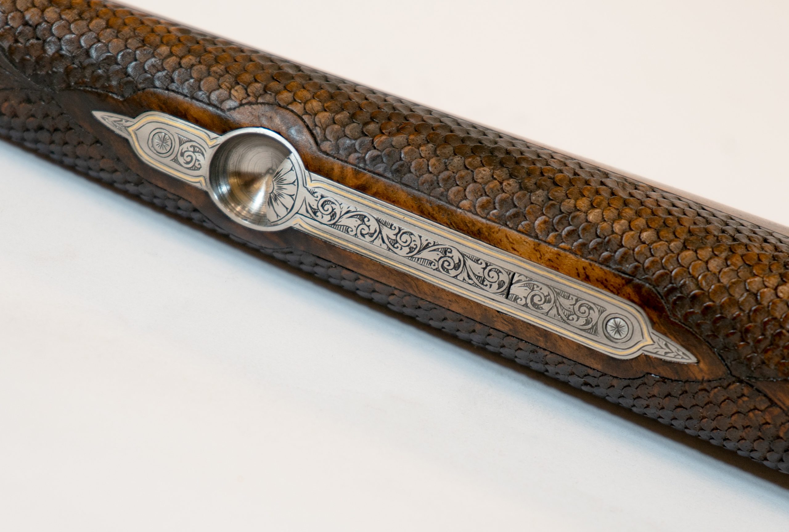 Gravur: Tiefgestochene Tierstückgravur, altdeutsche Arabeskenergänzung, Goldfaden mit Einrollungen