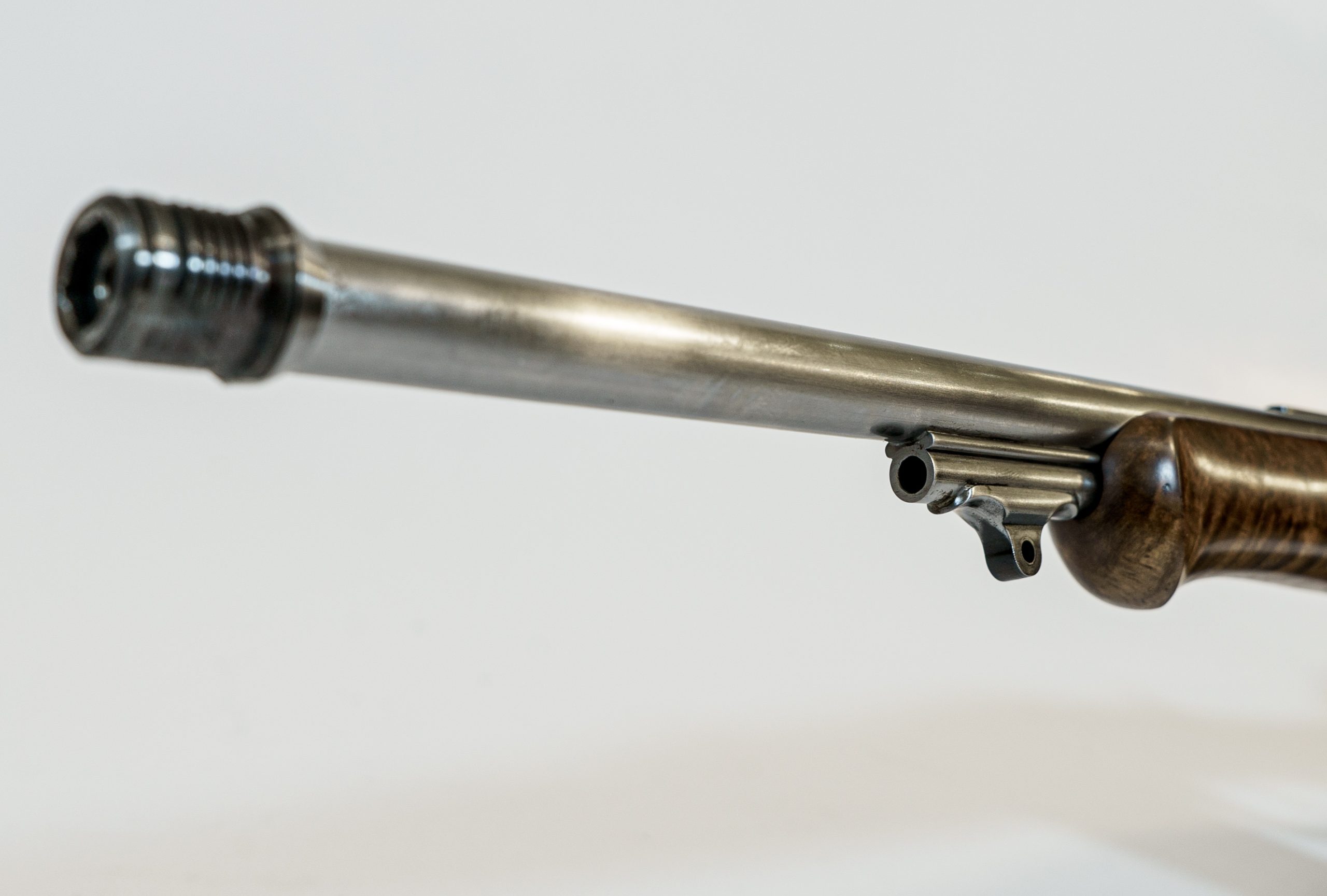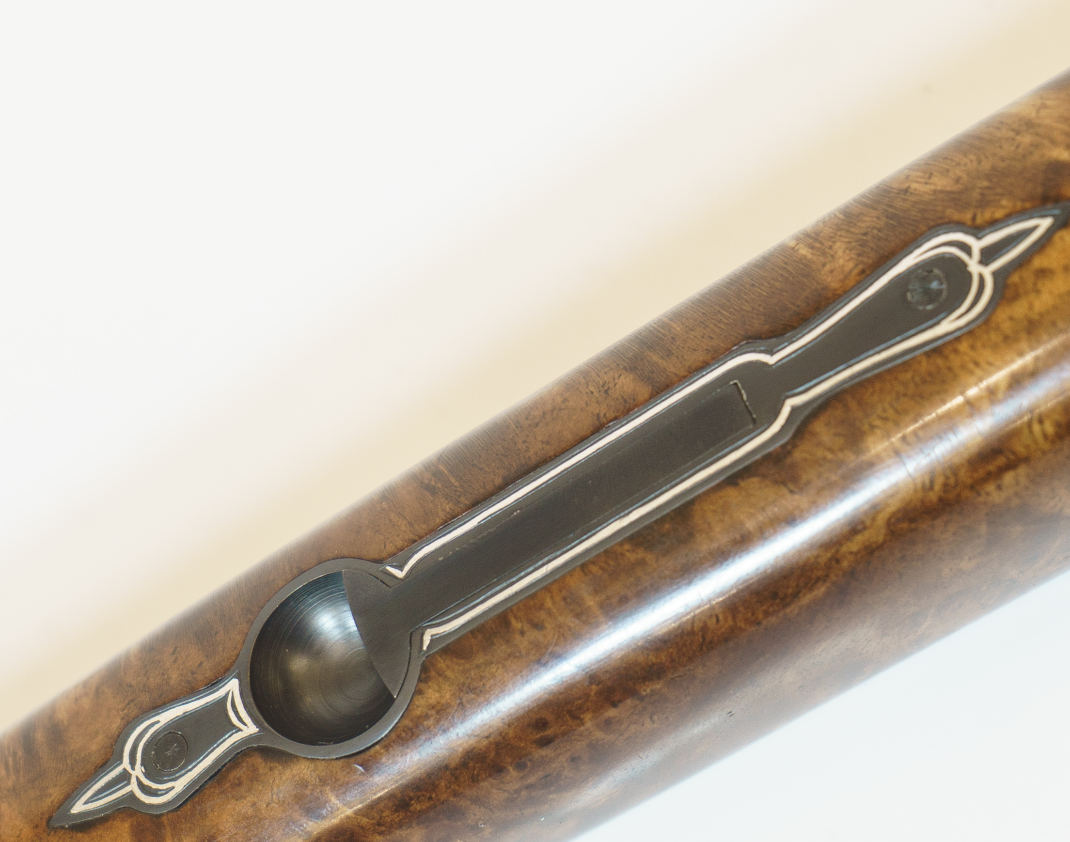 Schaft: Extrem fein gemaserter Vogelaugen Nußholz Wurzelschaft.