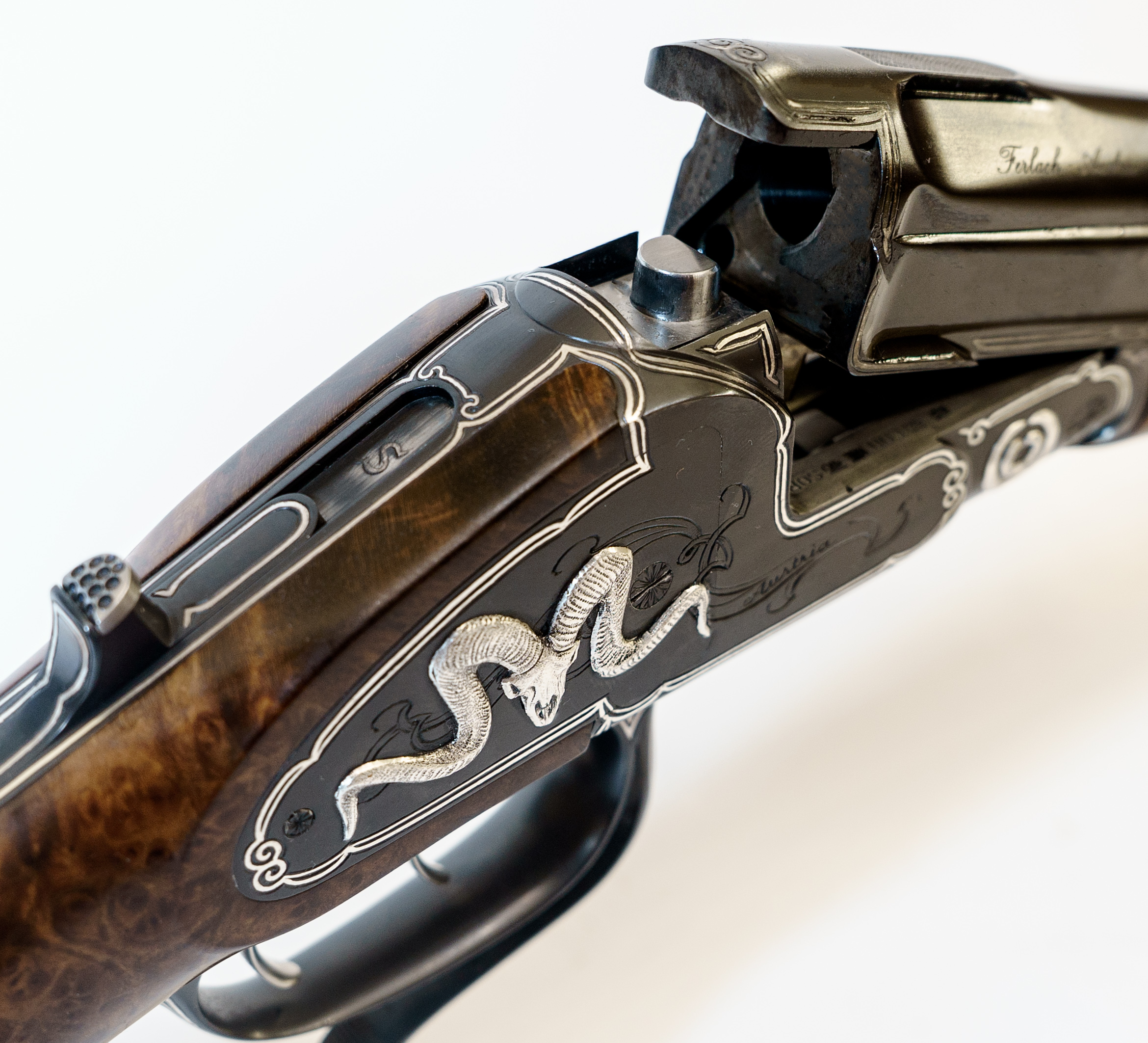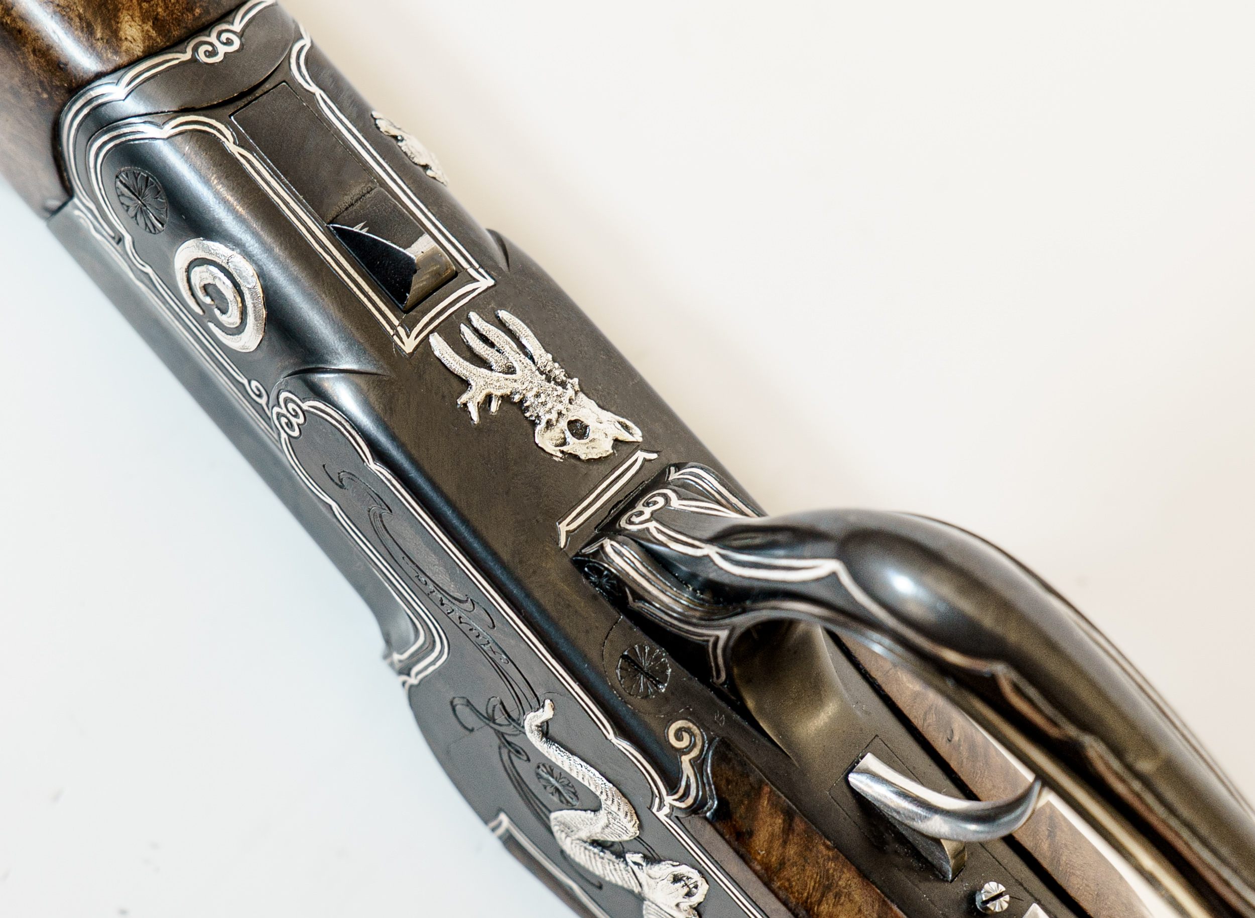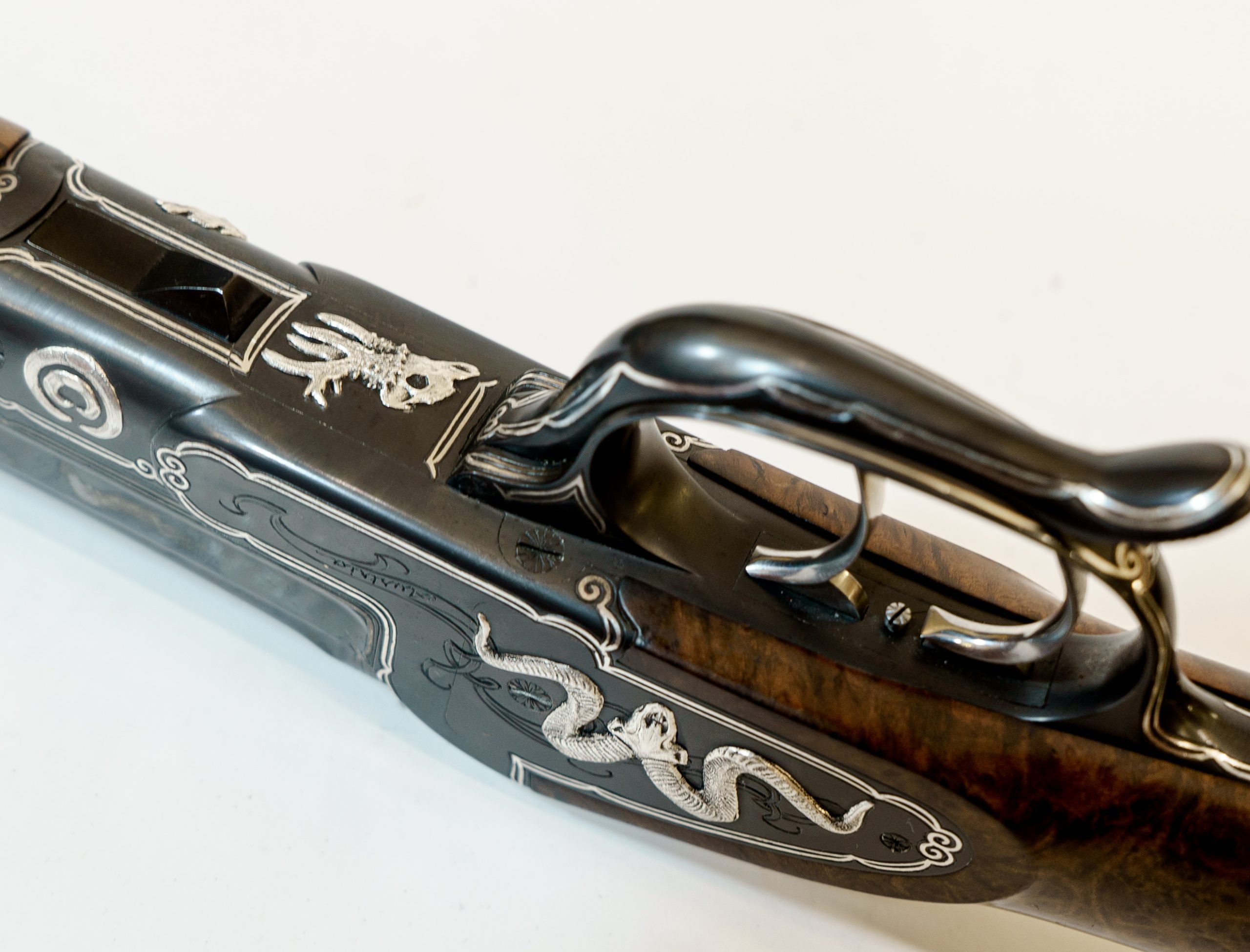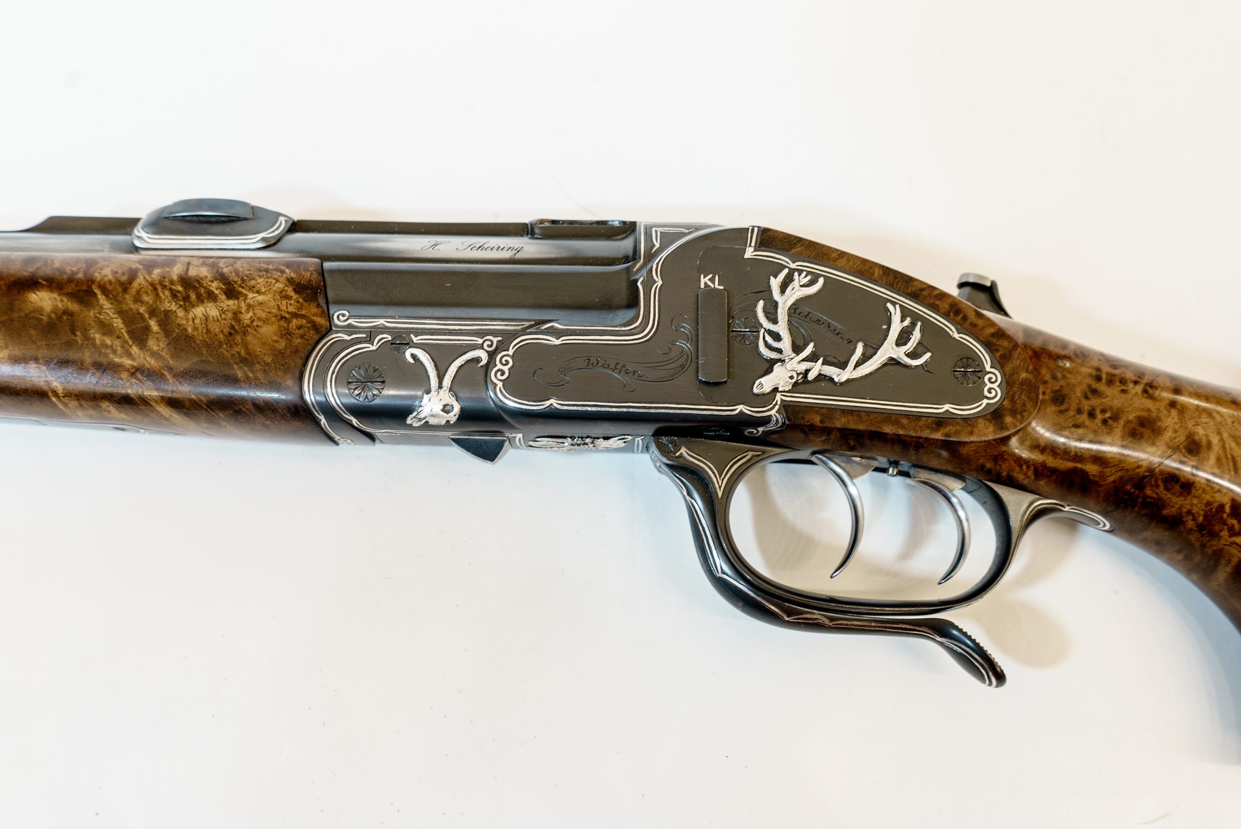 Gravur: Umlaufender Silberfaden mit Fahnen auf den Seitenplatten. System seidenmatt glänzend schwarz oxidiert. Am Baskül massiv plastisch eingelegte Trophäen in Silber.