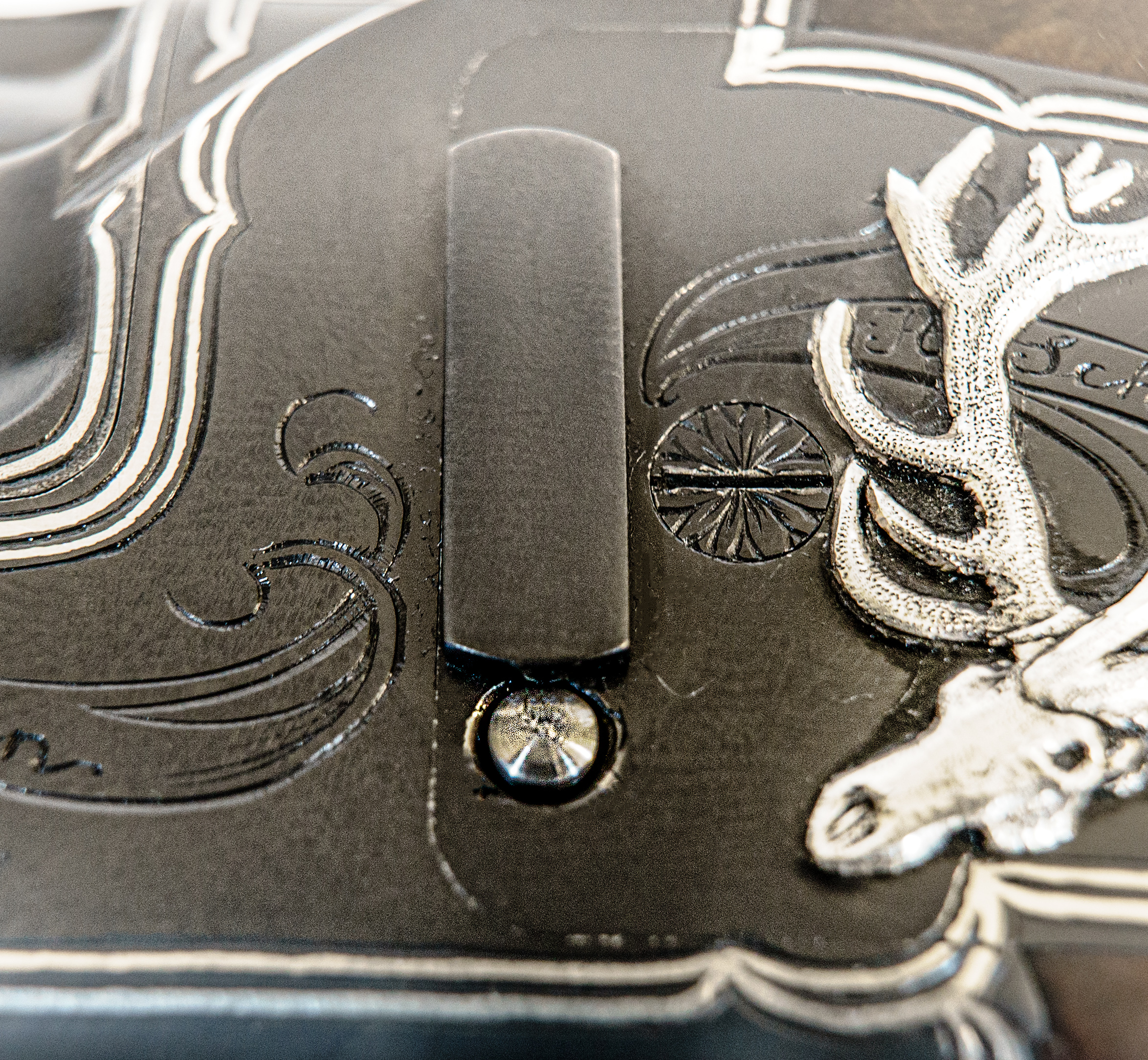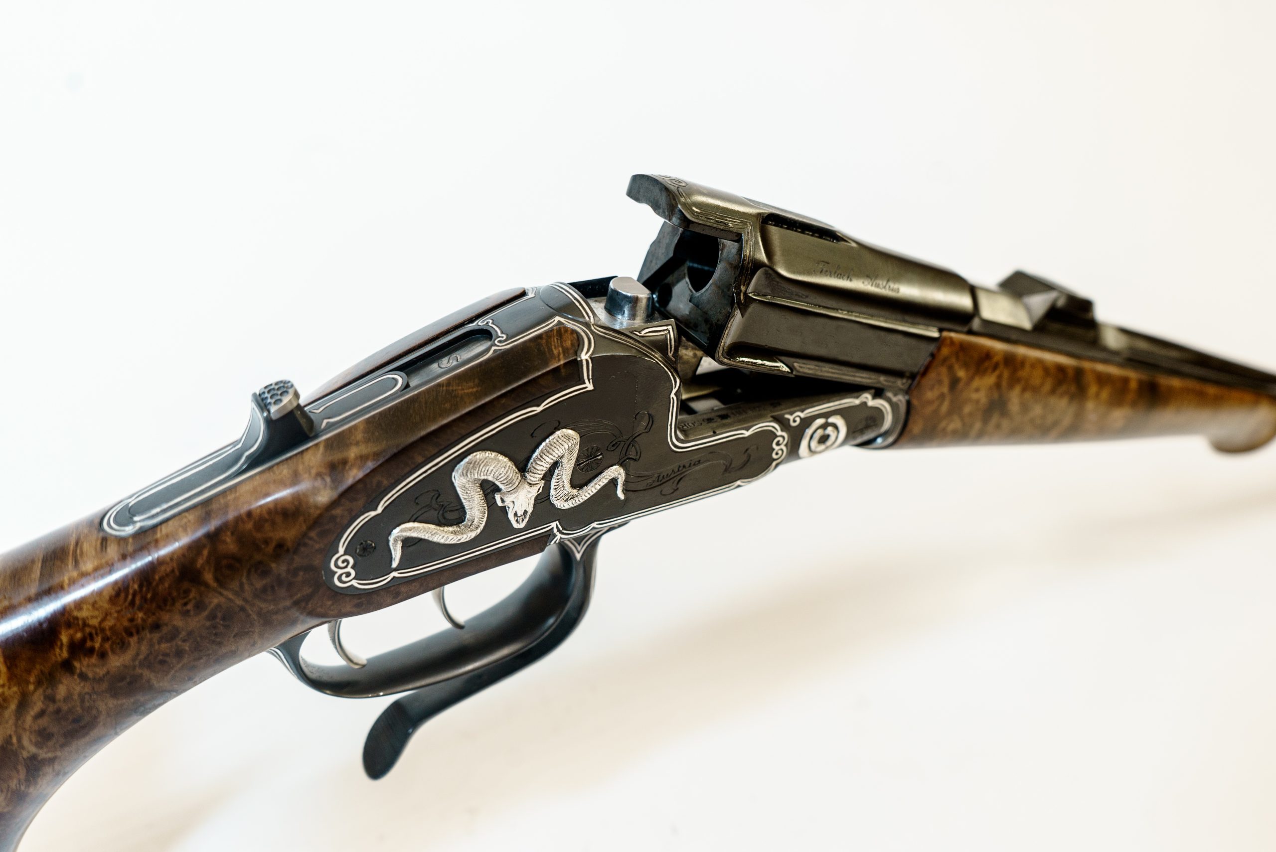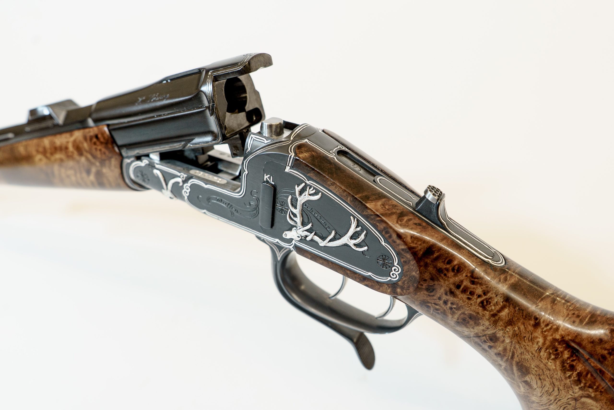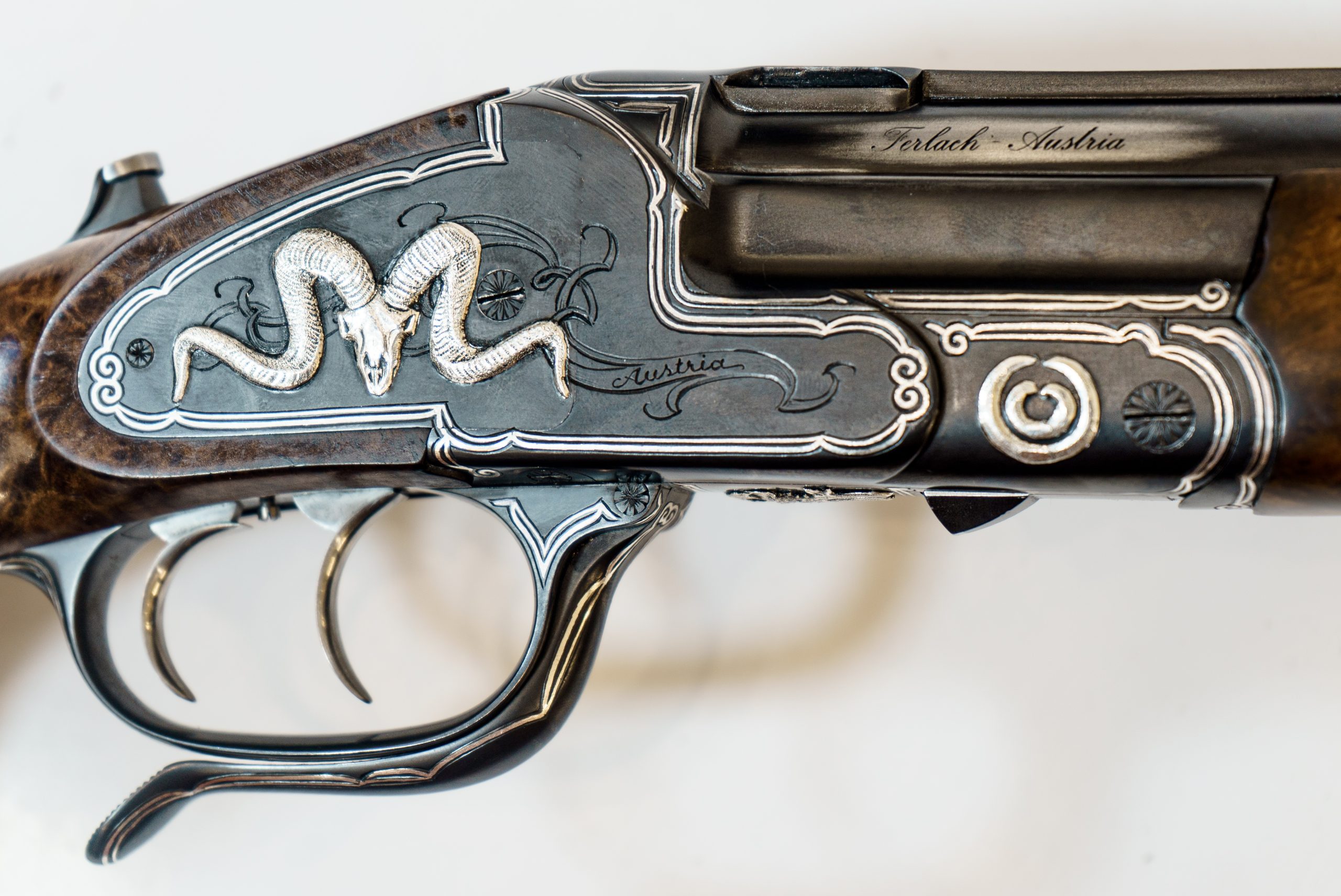 Gravur: Umlaufender Silberfaden mit Fahnen auf den Seitenplatten. System seidenmatt glänzend schwarz oxidiert. Am Baskül massiv plastisch eingelegte Trophäen in Silber.