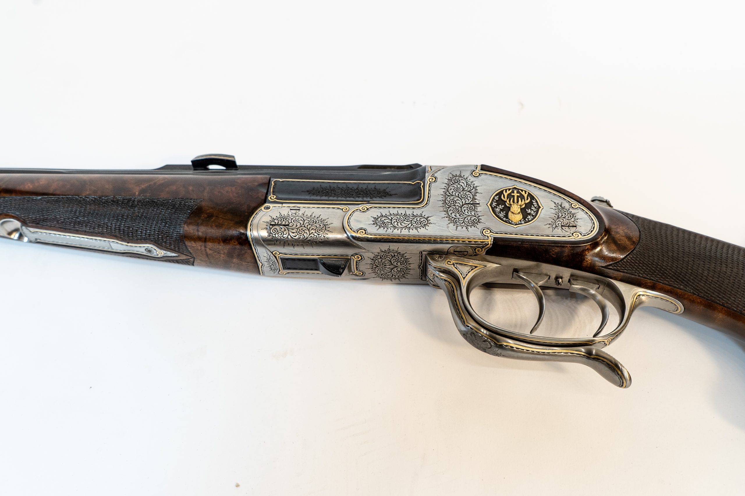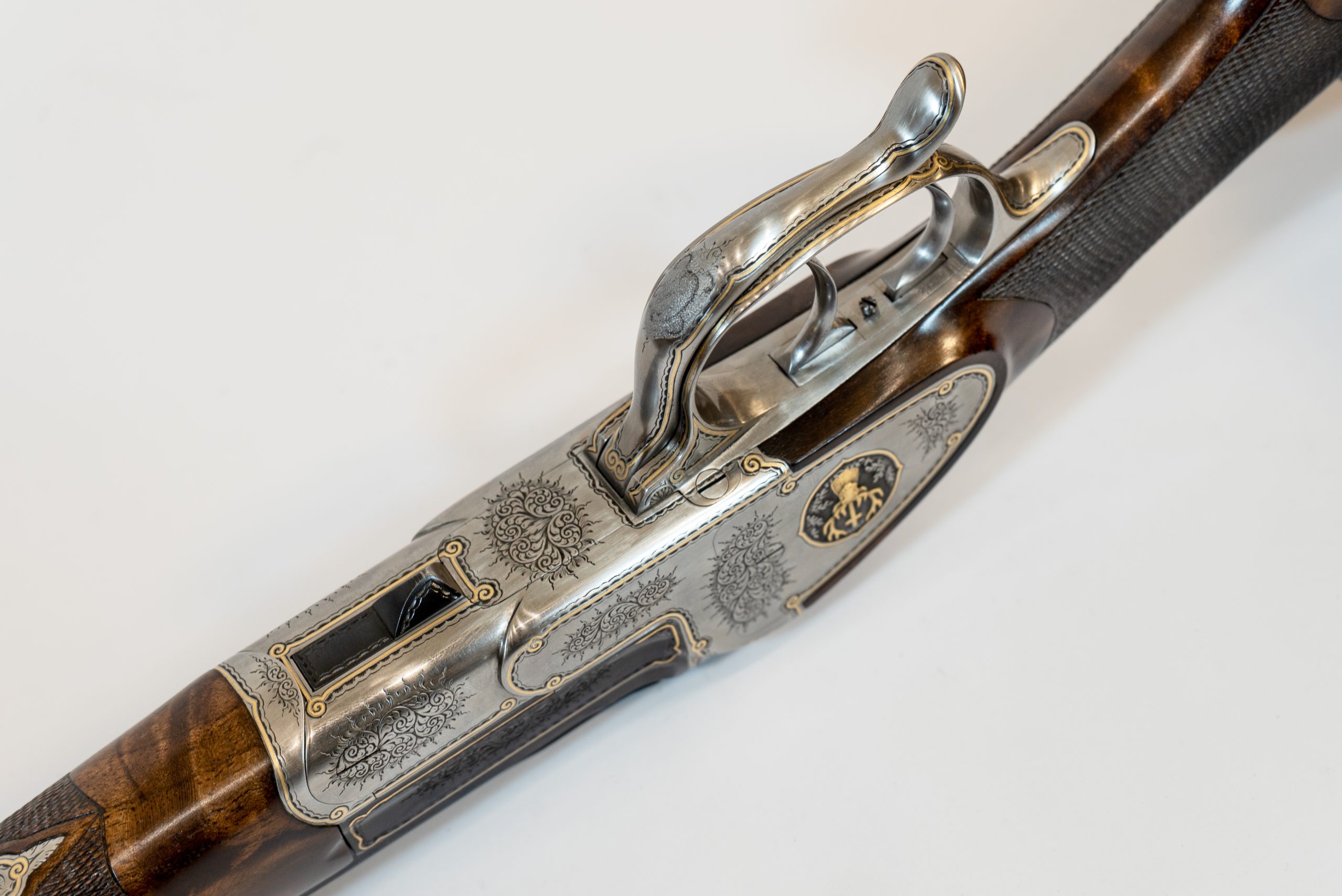 Schaft: Sehr feiner Wurzelmaserholzschaft mit Kaisergriff und englischer Fischhaut.