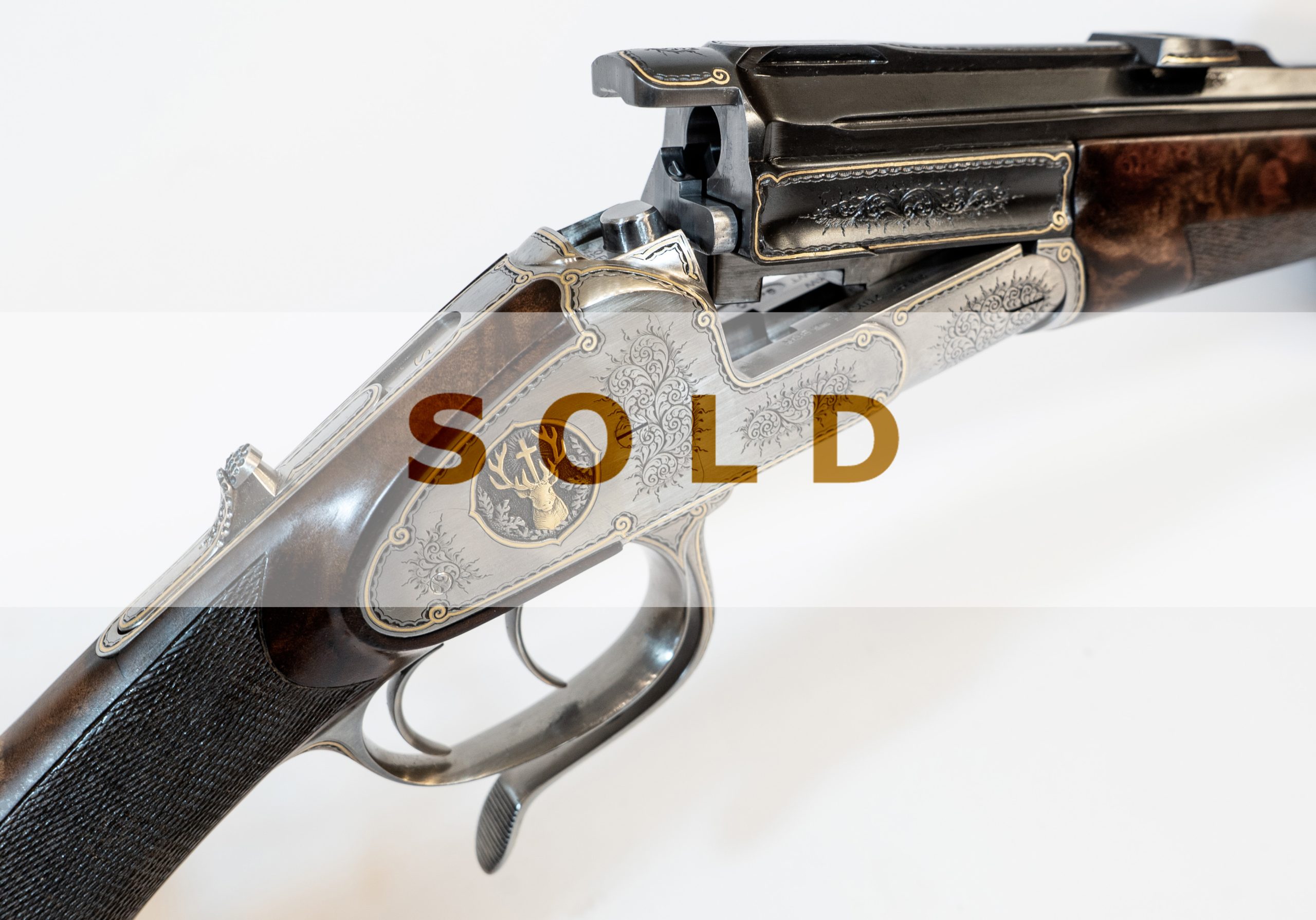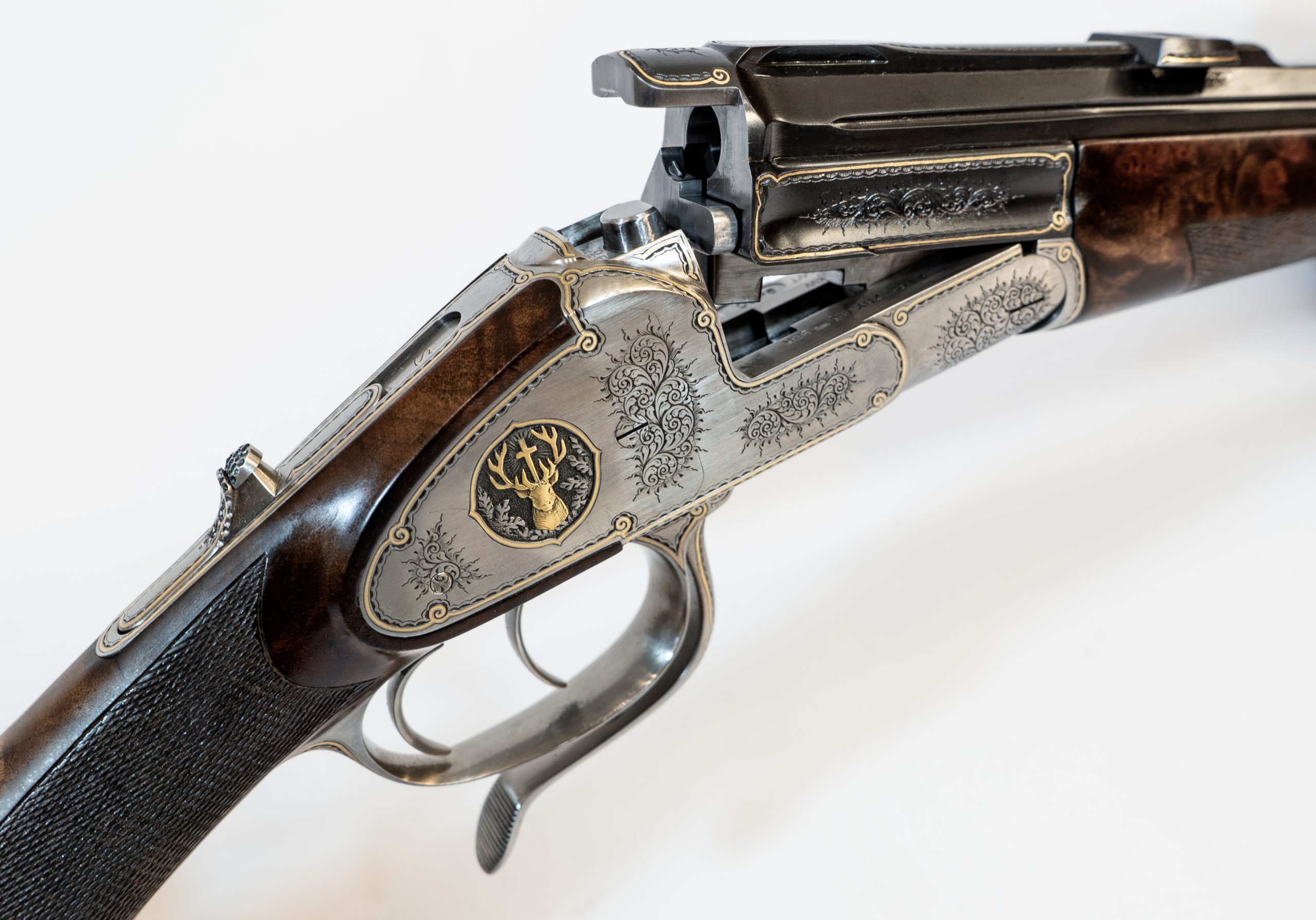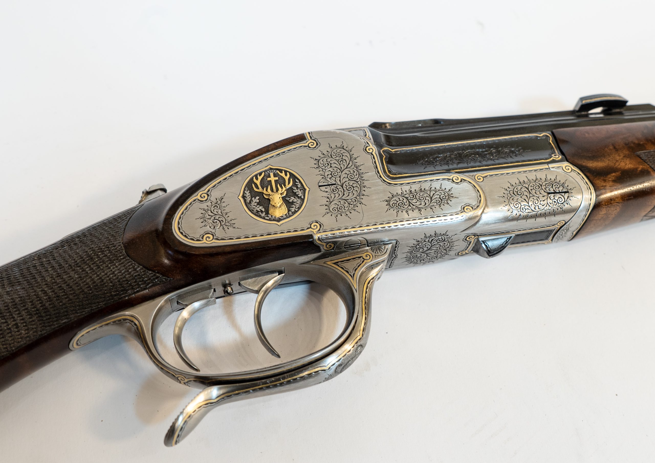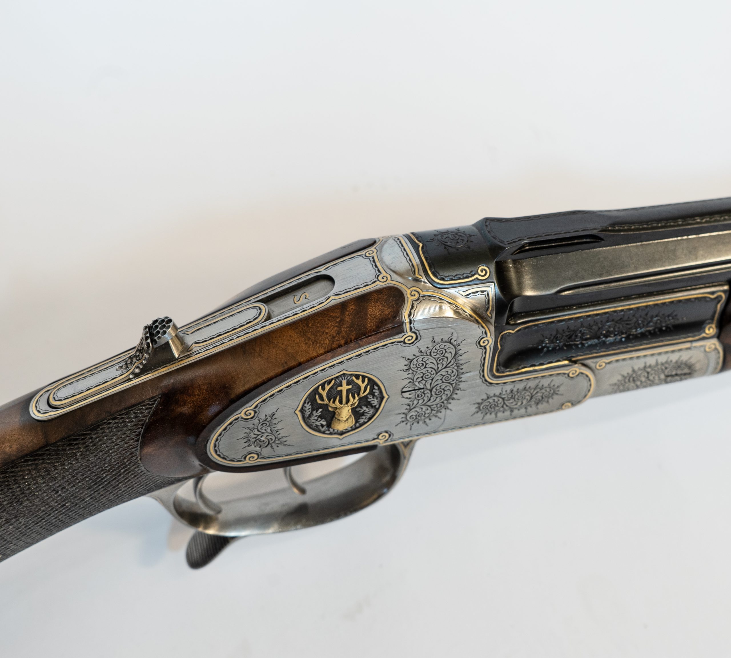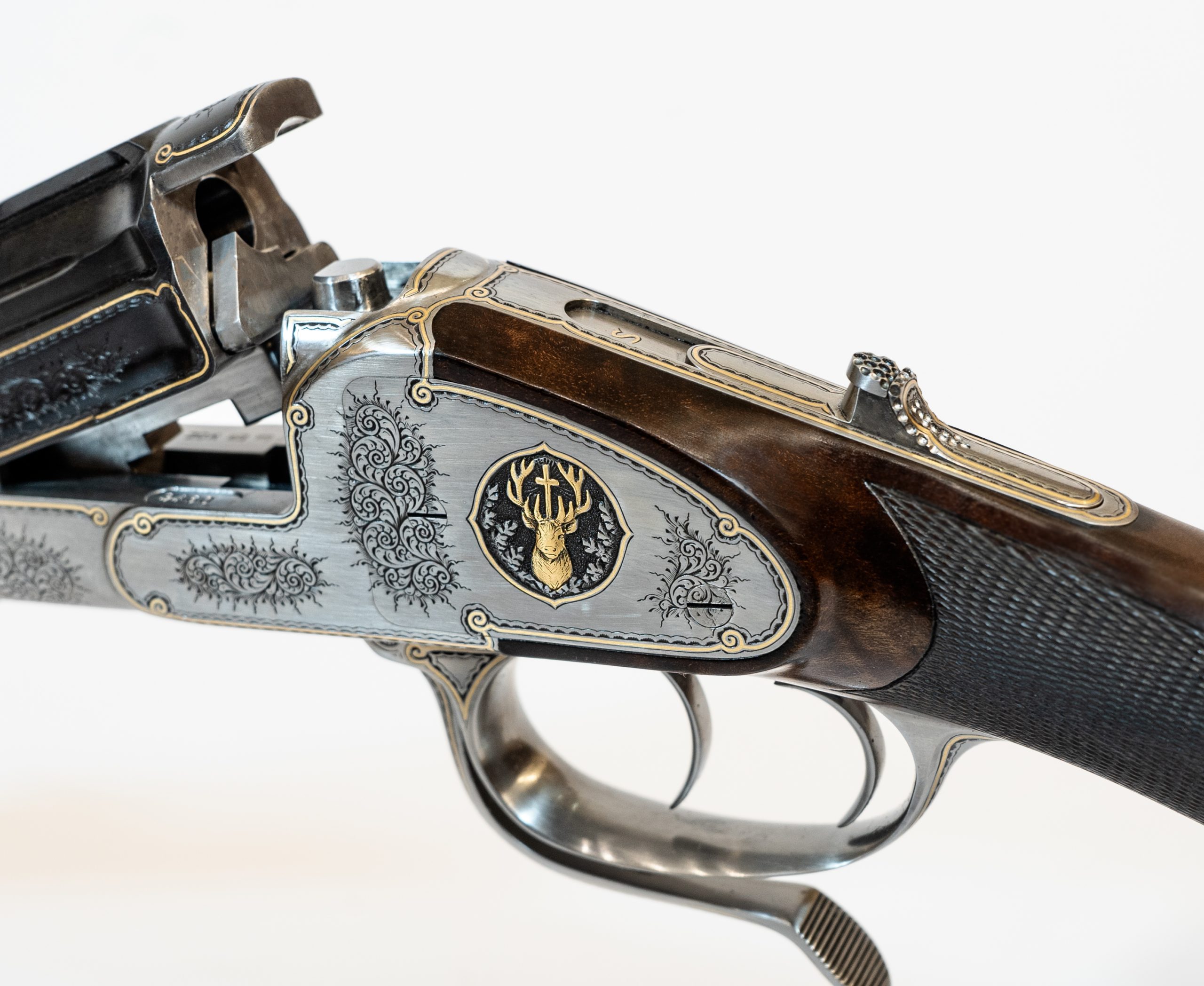 Gravur: Feiner umlaufender Goldfaden mit Einrollungen. Altdeutsche Arabeskengravur nicht vollflächig ausgeführt. Auf den massiven Seitenplatten je ein Hubertushirsch massiv in Gold eingelegt mit Blattverzierungen.