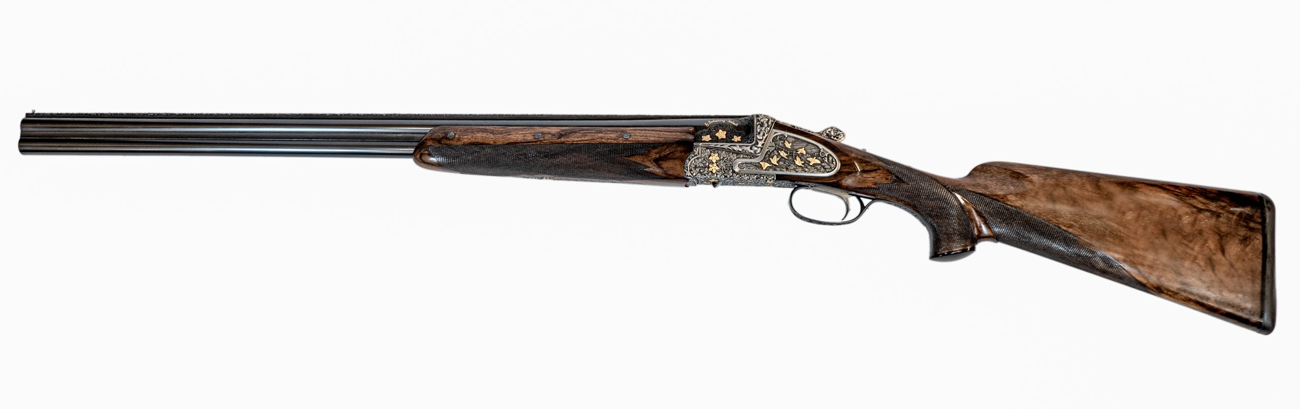 Schaft: Wurzelmaserholzschaft mit englischer Fischhaut und Kaisergrif.
