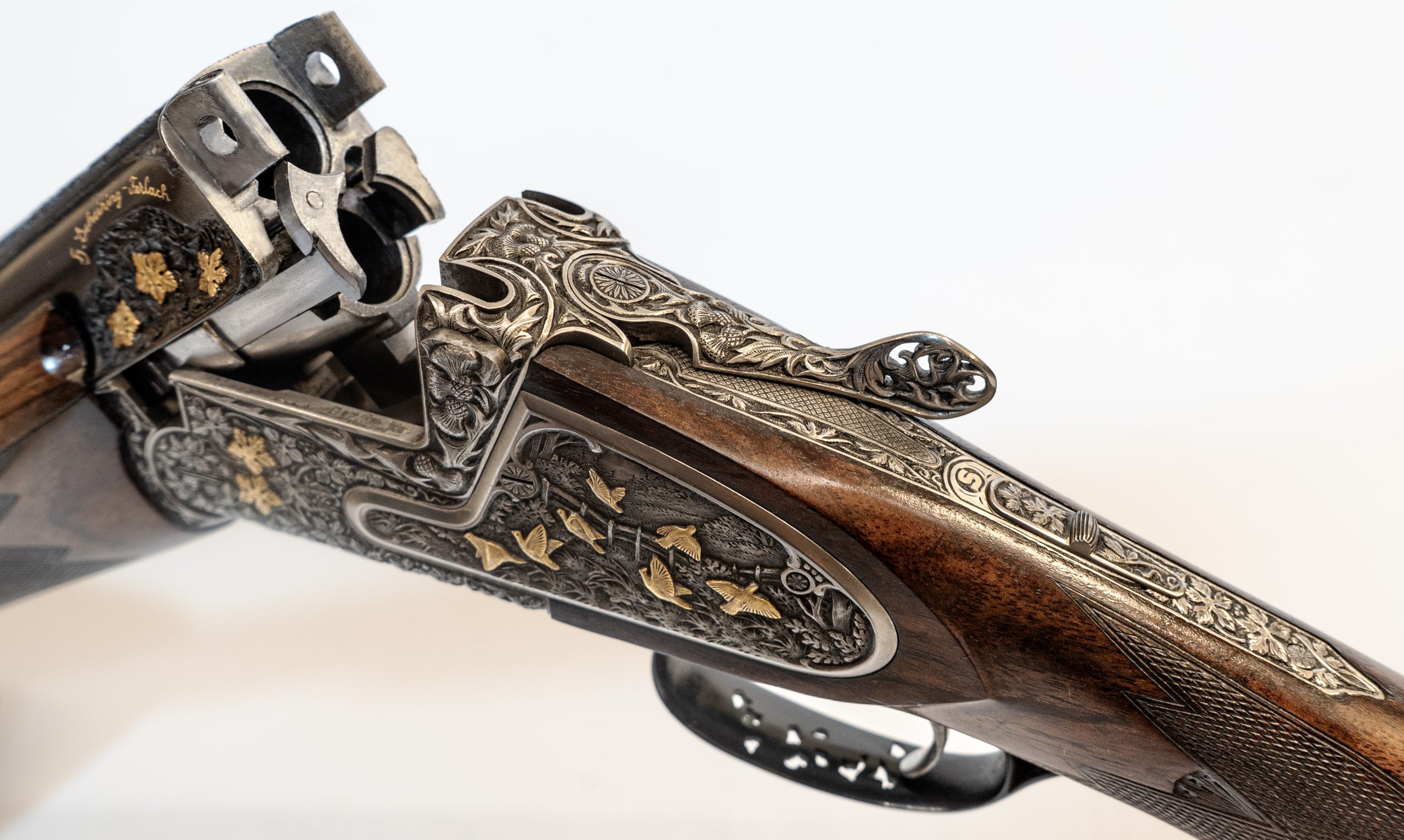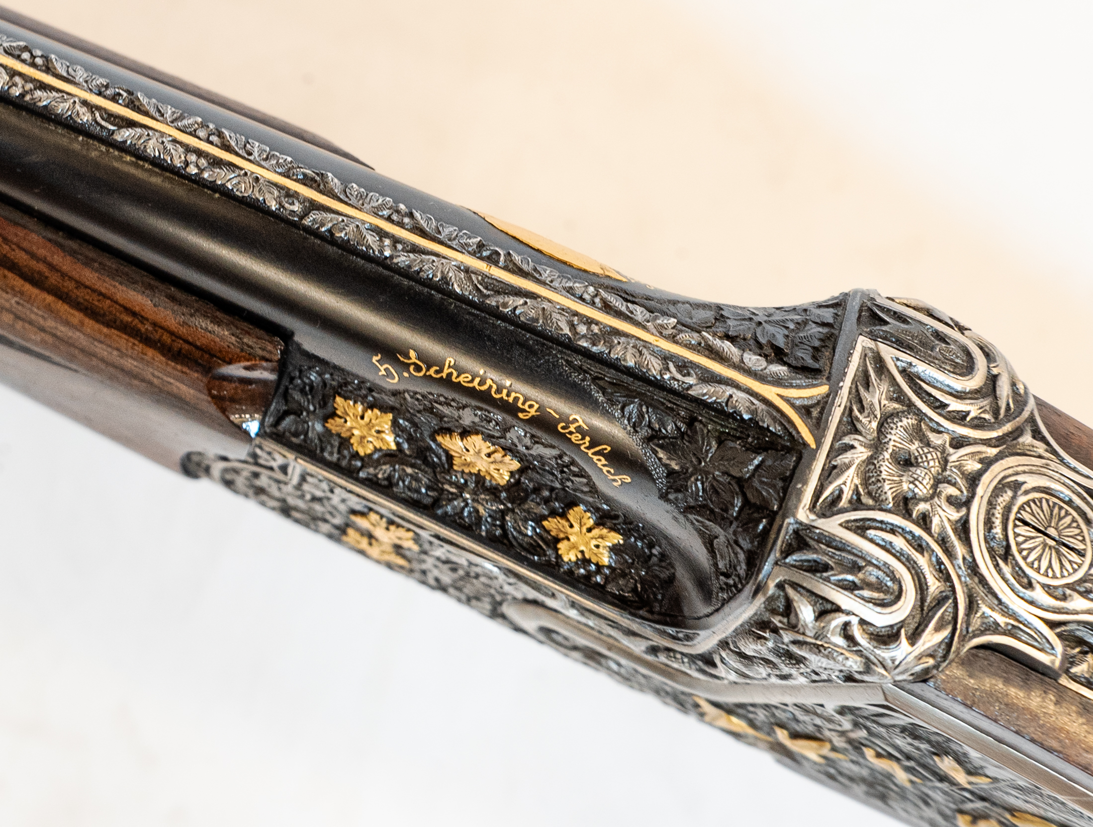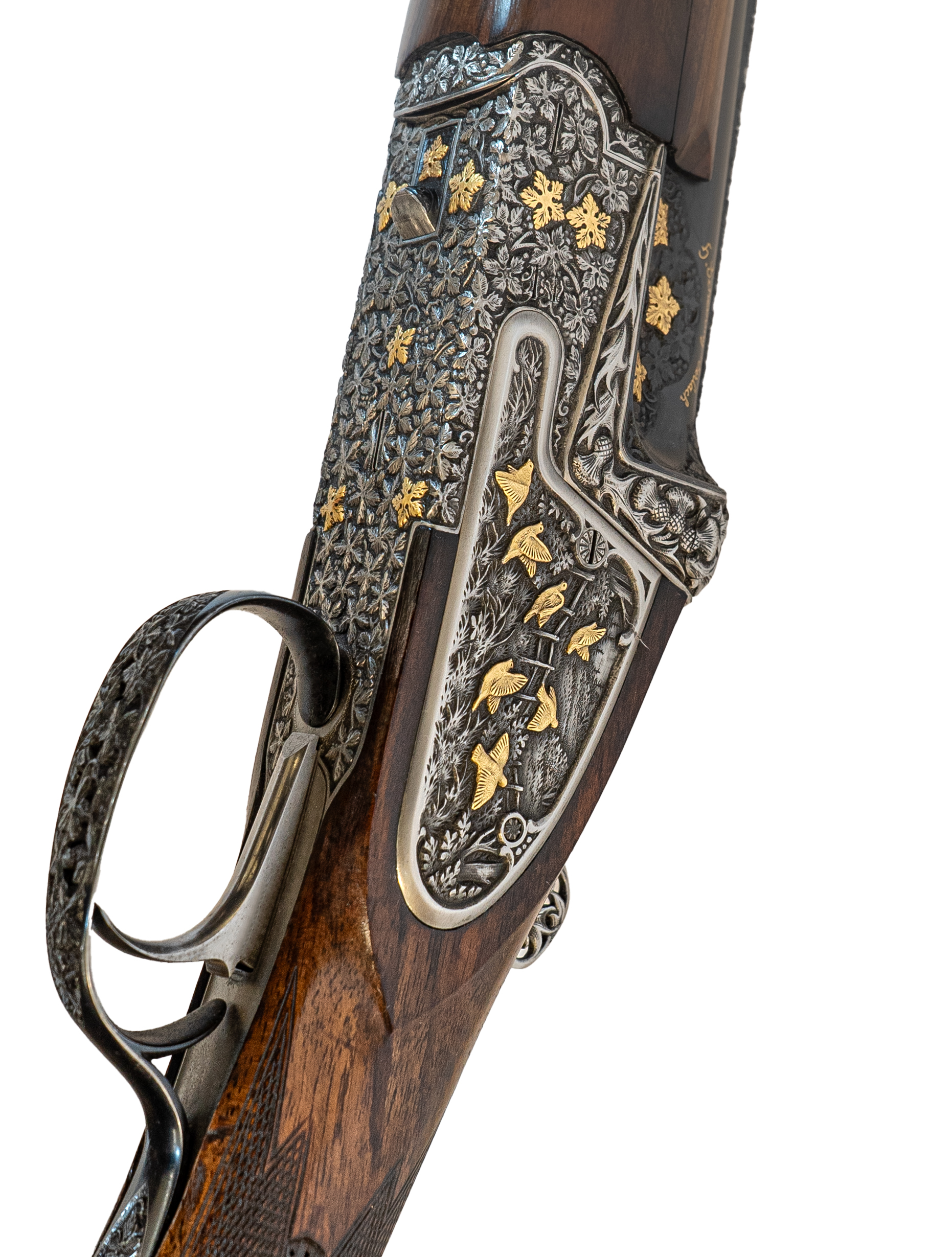 Gravur: Feine Weinlaubgravur plastisch ausgeführt. Einige Weinblätter massiv in Gold ausgeführt. Auf den Seitenplatten Flugwildszenen: links Rebhühner, rechts Enten.