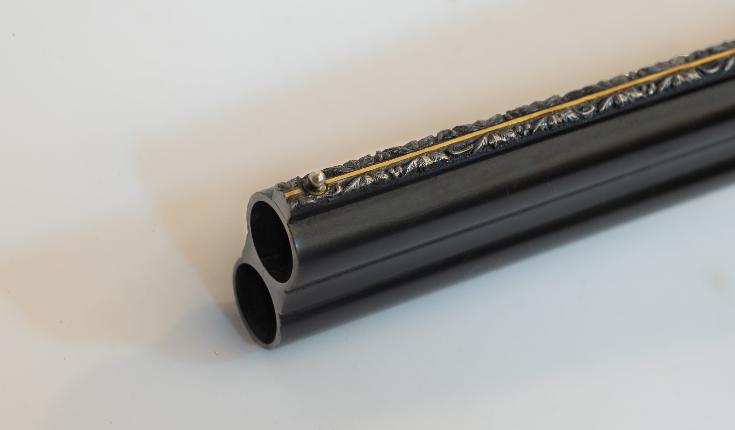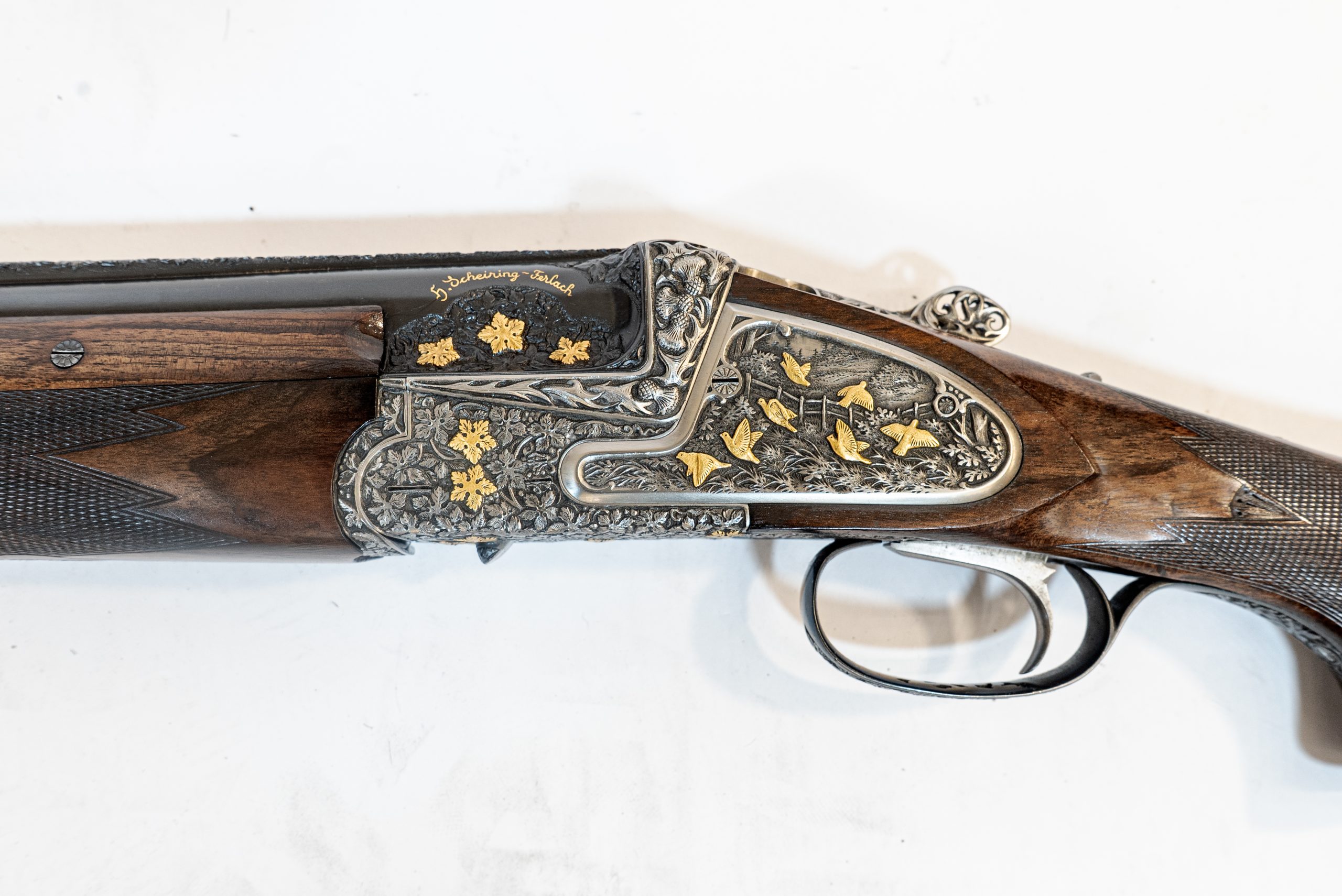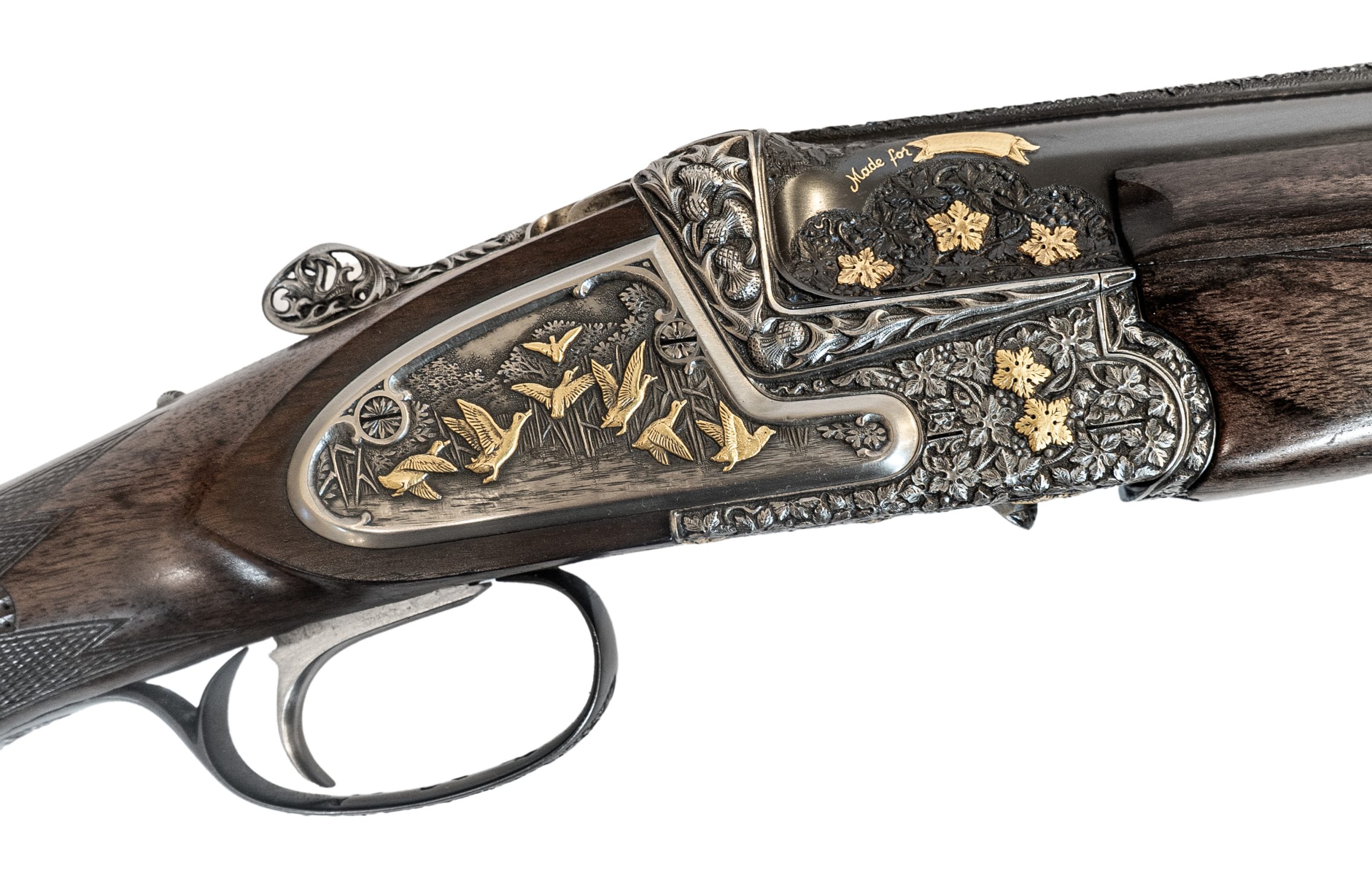 Gravur: Feine Weinlaubgravur plastisch ausgeführt. Einige Weinblätter massiv in Gold ausgeführt. Auf den Seitenplatten Flugwildszenen: links Rebhühner, rechts Enten.