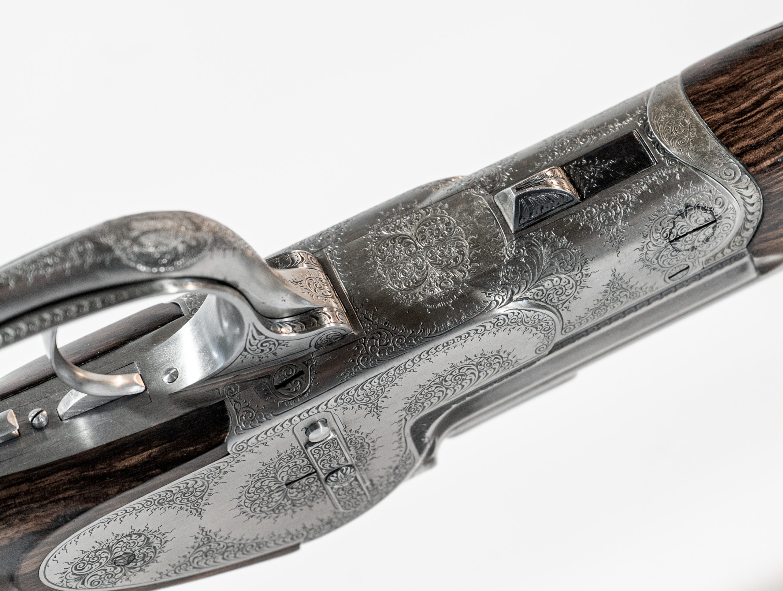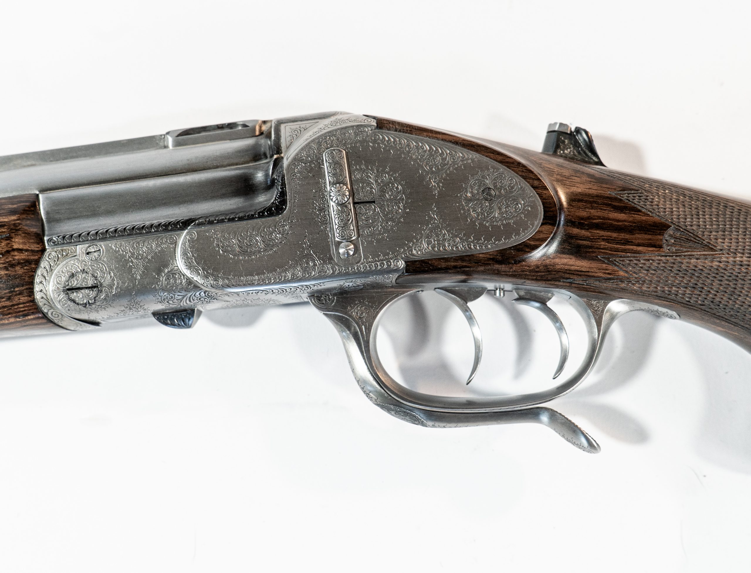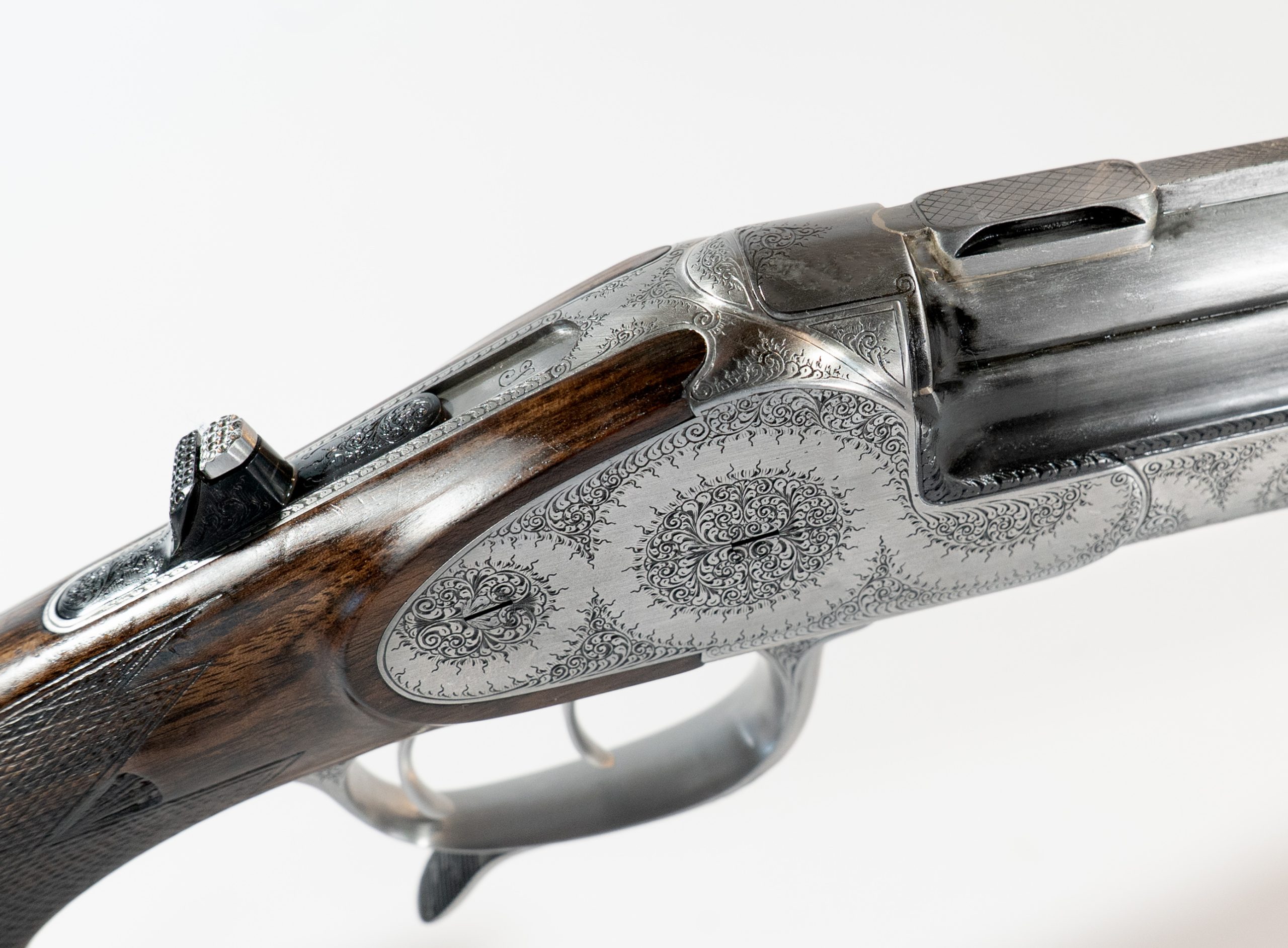 Schaft: Sehr feiner Wurzelmaserholzschaft mit englischer Fischhaut.