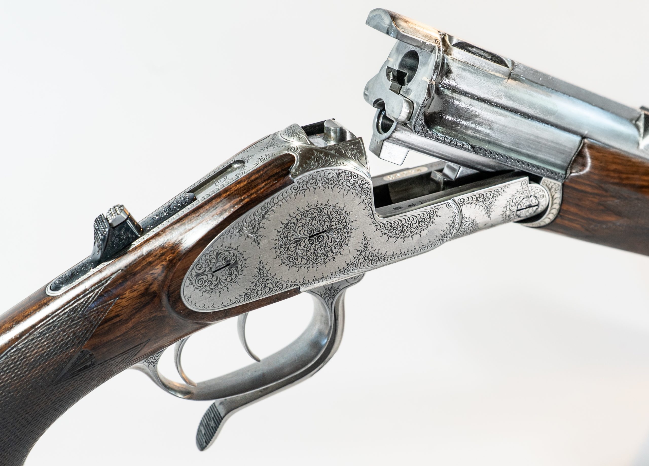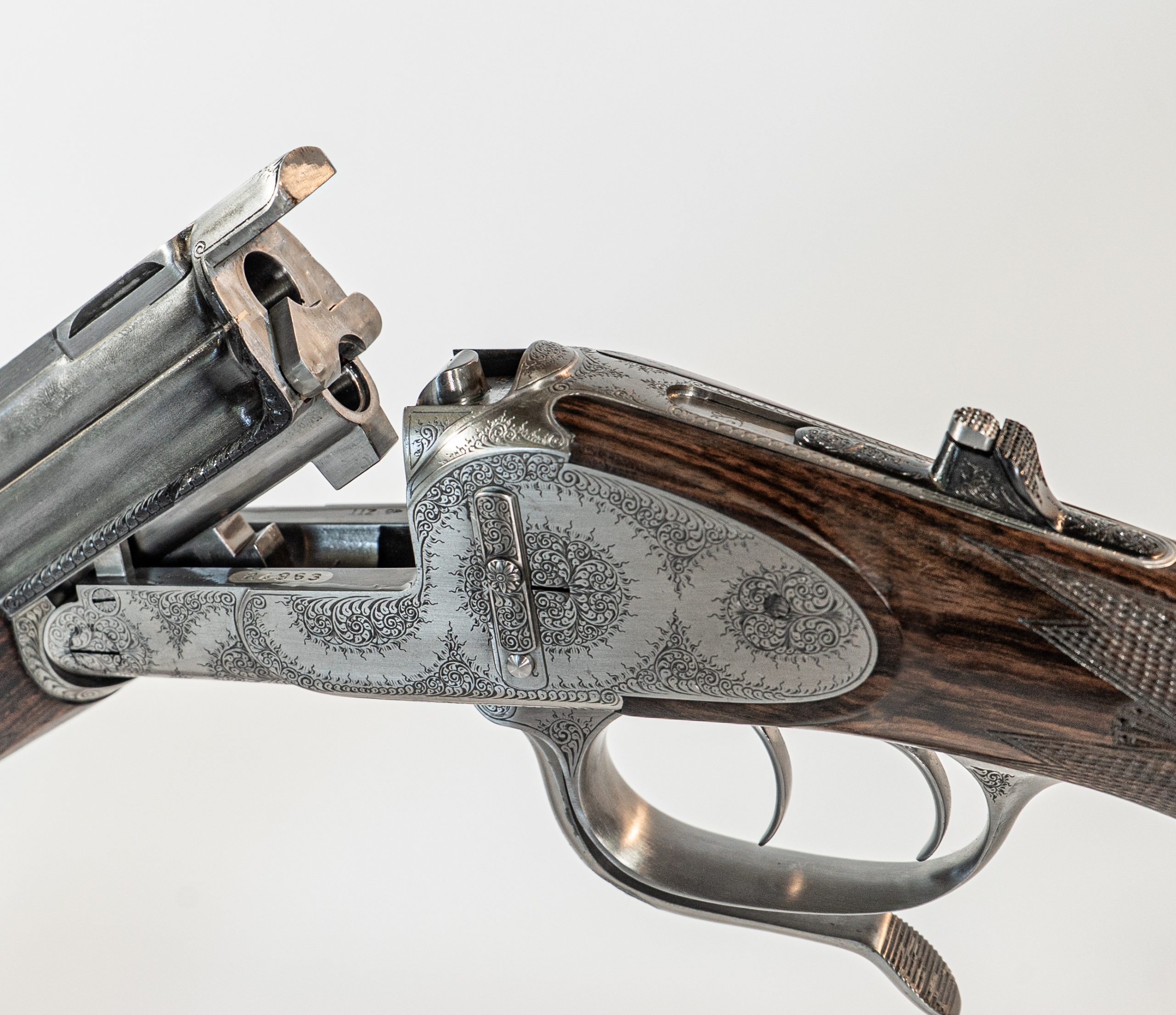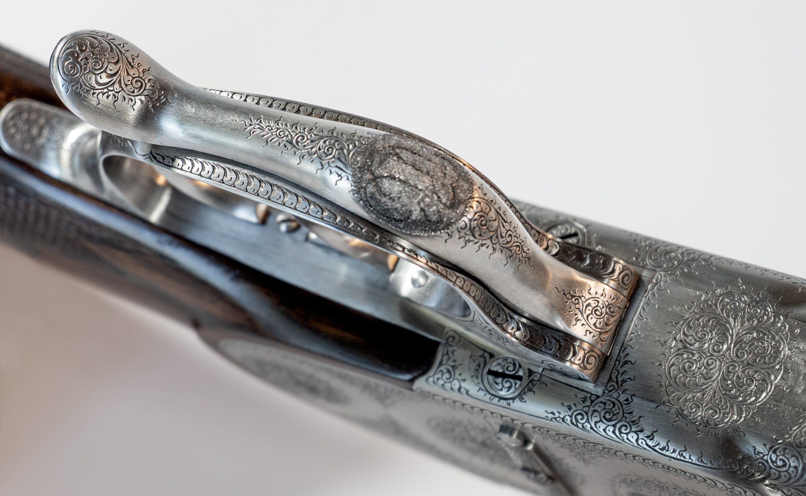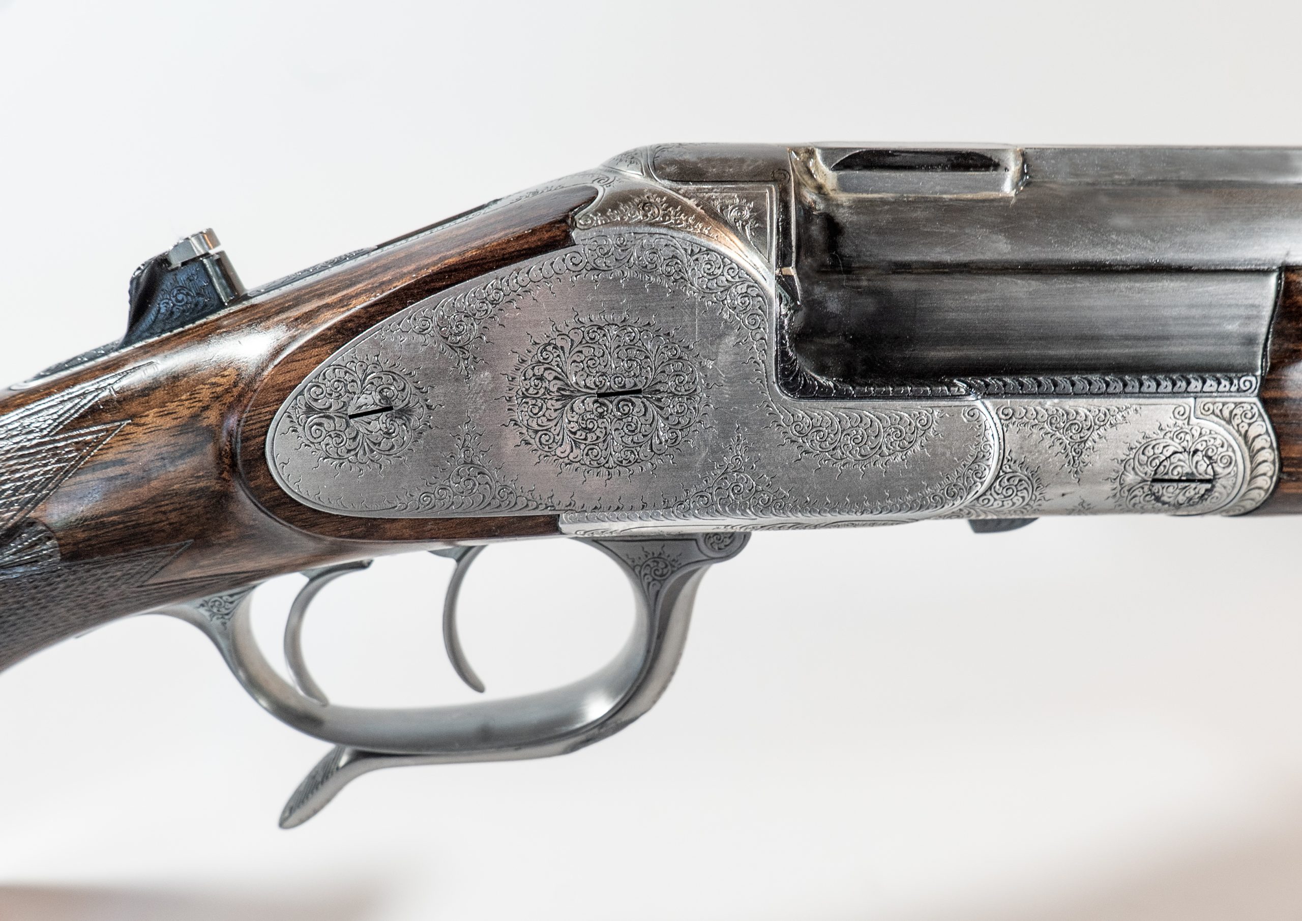 Schaft: Sehr feiner Wurzelmaserholzschaft mit englischer Fischhaut.